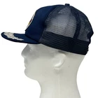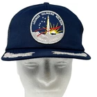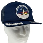 NASA Space Shuttle STS-26 Trucker Hat Vintage 80s Discovery Frederick Hauck Richard Covey John Lounge David Hilmers George Nelson Kennedy Space Center Florida Blue The Actioncap Embellishments Silver Gold Leaf Leaves Scrambled Eggs Mesh Five Panel A-Frame Baseball Cap Made In USA Will be shipped in a box. Condition: Has light staining on the sweatband and one missing snap. No other flaws noticed. Has been cleaned and sanitized. See photos.