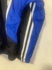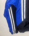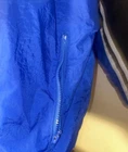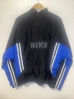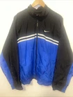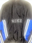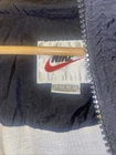 Vintage NIKE Windbreaker Jacket in Black and Gray color block design. This jacket features an embroidered spellout logo on the front, full zip closure, and zipped pockets. The jacket is made of polyester and nylon fabric, making it perfect for the summer, fall, and spring seasons. The jacket is in a size large and has a regular fit. It has a spread collar style, elastic waist, and is machine washable. The lining material is also polyester, and the insulation material is polyester. The jacket is a perfect addition to any casual outfit and has a grunge, 90s, and sports theme. Only flaws it has inside shown on pictures this item was washed