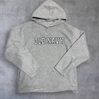 This is a vintage Old Navy sweatshirt for men in size L, featuring a drawstring closure, crew neck, and fleece fabric. The gray hoodie has a spellout logo design, long sleeves, and a pouch character detail. It is suitable for all seasons and showcases a solid pattern. The material is polyester, and the style is a pullover. The sweatshirt is branded by Old Navy and has a regular fit.