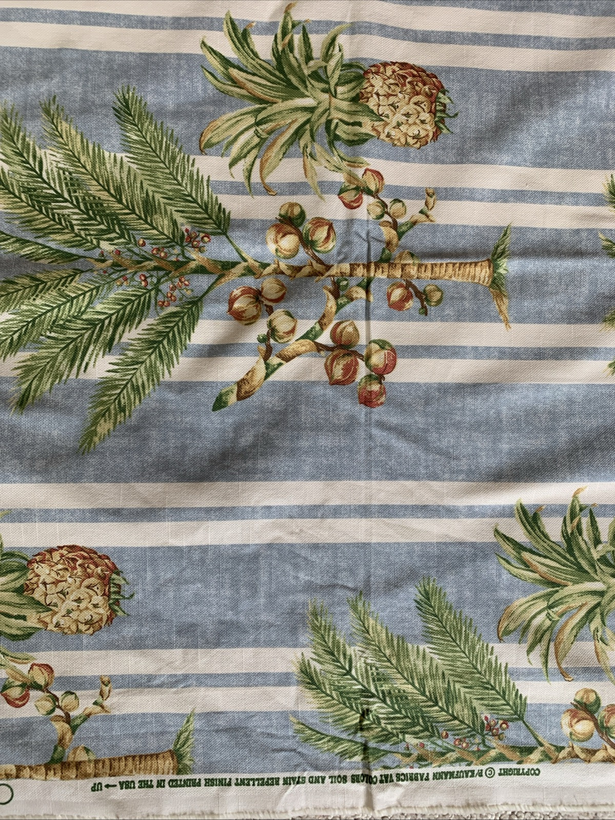 Enhance your home decor with this beautiful P. Kaufmann Cotton Classic Stripe Fabric. The fabric features a blue and green striped pattern with tropical greenery, making it perfect for accessories, bags, curtains, drapery, home decor, bedding, crafts, cushions, blankets, throws, and pillows. It measures 3.3 yards in length and 56" inches in width, making it suitable for various applications. This vintage fabric is made in the United States and has a medium weight. It is suitable for various rooms in your home, including the living room, bedroom, and dining room. This fabric is perfect for those who love antique and vintage styles. Get creative with this beautiful fabric and make your home look amazing. The pieces is pre-owned, but new and never used. Has been stored, and is from a stash.