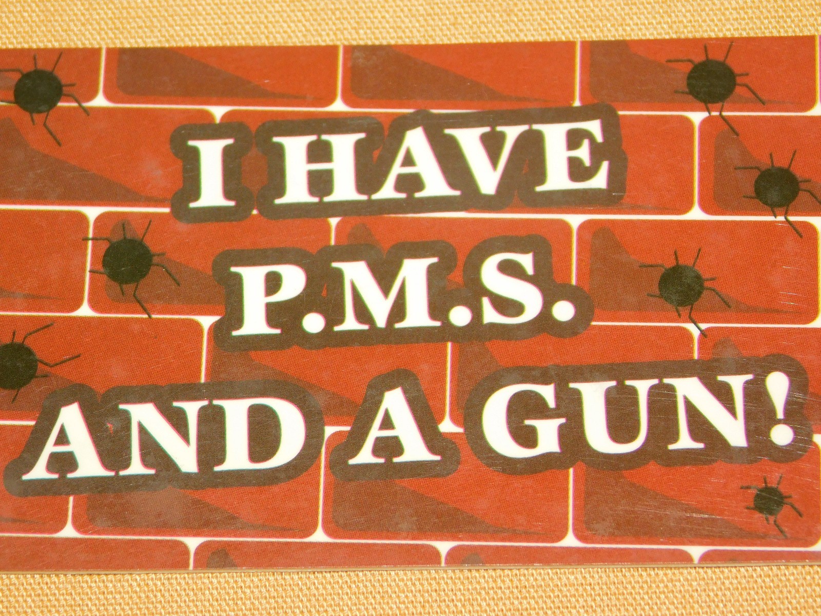 YOU ARE BIDDING ON...... . . VINTAGE NOVELTY GAG GIFT COOL STUFF I HAVE P.M.S. AND A GUN EXCUSE ME CARD ... .. ..PLASTIC.... MEASURES APPROX 3 3/8" X 2 1/8"........ SHOWS SOME HANDLING/ AGE WEAR..........PLEASE VIEW PHOTOS FOR CONDITION.***PLEASE E-MAIL IF YOU HAVE A QUESTION OR WANT AN ADDITIONAL PICTURE....PLEASE VISIT MY EBAY STORE FOR ADDITIONAL VINTAGE ITEMS..THANK YOU*** 12P-8765-XXXX