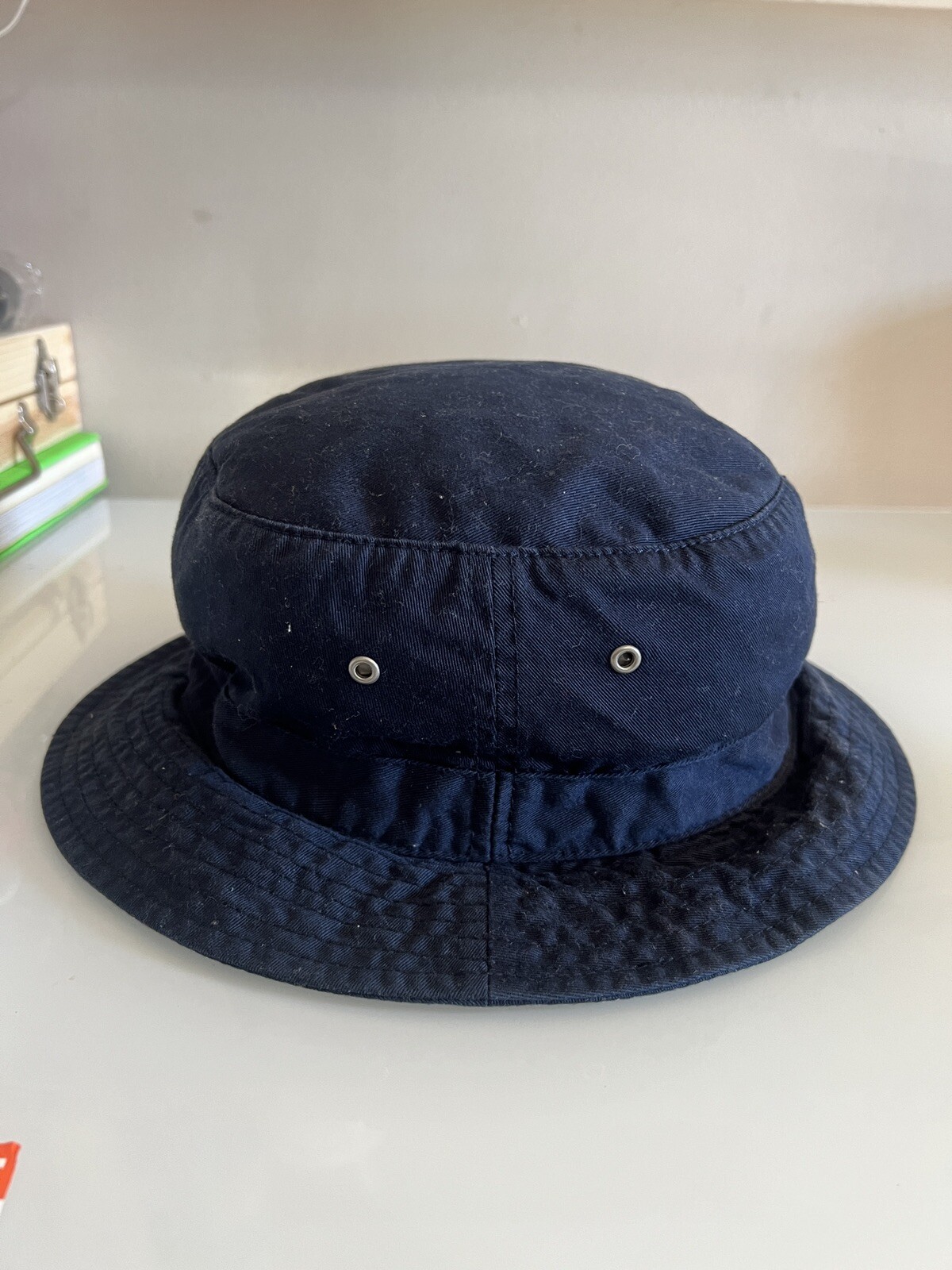 This Ralph Lauren CHAPS bucket hat is the perfect addition to any casual outfit. The navy blue color and solid pattern make it a versatile piece for any occasion. Made of lightweight and breathable cotton fabric, it features vent holes for comfort and a pocket for added convenience. The unisex design and American street theme make it a stylish choice for any fashion-forward individual. Whether you're going out for a hike or just running errands, this hat is sure to be a go-to. It's not signed or personalized, but it's a classic piece from the Chaps product line. Get yours today!
