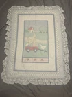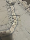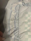 Item is 41” long, 30” wide (doesn’t include ruffle). Item has loose threads and has a stain on ruffle upper left corner. See pictures. Item also has fuzzies.