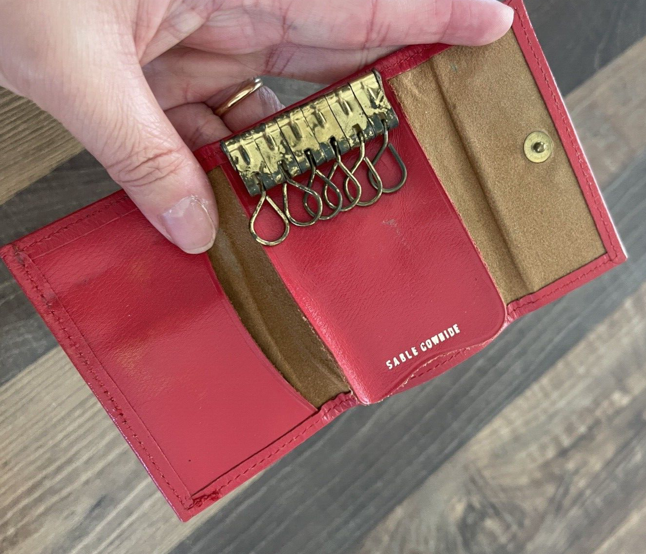 This vintage red sable cowhide leather key holder case is the perfect addition to any boho-inspired outfit. With 6 hooks, it can hold all your keys in one convenient location. The folding style makes it easy to slip into your pocket or purse, while the solid pattern in red adds a pop of color to your accessories collection. -3.5 X 2 inches, shows wear throughout upper leather and hardware shows tarnishing Crafted from high-quality leather, this key wallet is durable and long-lasting. The XS size is perfect for women who prefer smaller accessories, and the designer theme adds a touch of sophistication. This wallet is pre-owned but remains in excellent condition, ready to add a stylish flair to your everyday look.
