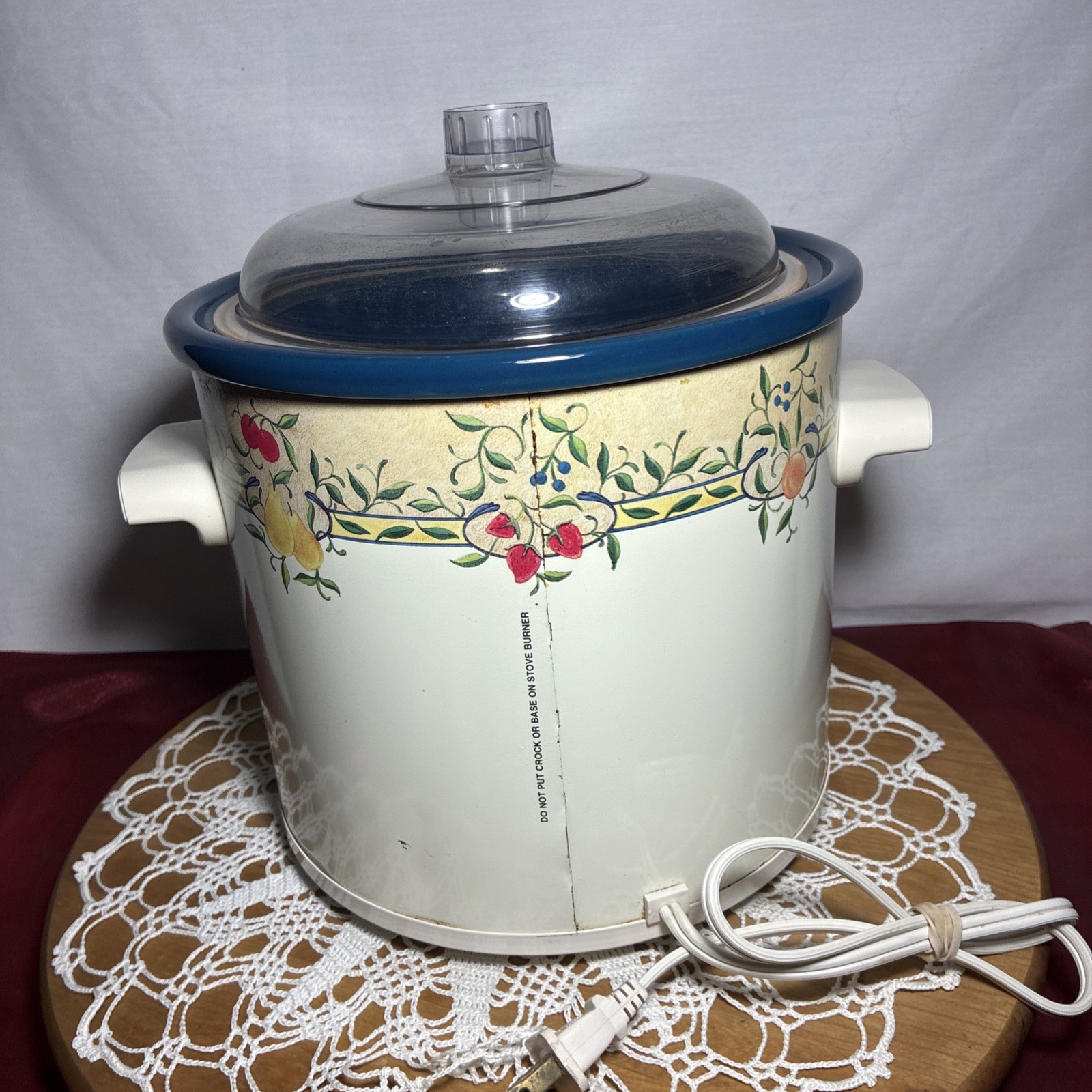The Vintage Rival Crock Pot 3.5 Quart Model 3100 in blue with a fruit design is a charming and functional slow cooker. This electric appliance features a 3.5 quart stoneware pot with a stainless steel finish, stay-cool handles, and a portable design for ease of use. With a power range of 215-325 watts and three settings/programs, this Rival crock pot is a reliable and stylish addition to any kitchen, perfect for preparing delicious meals with ease.