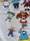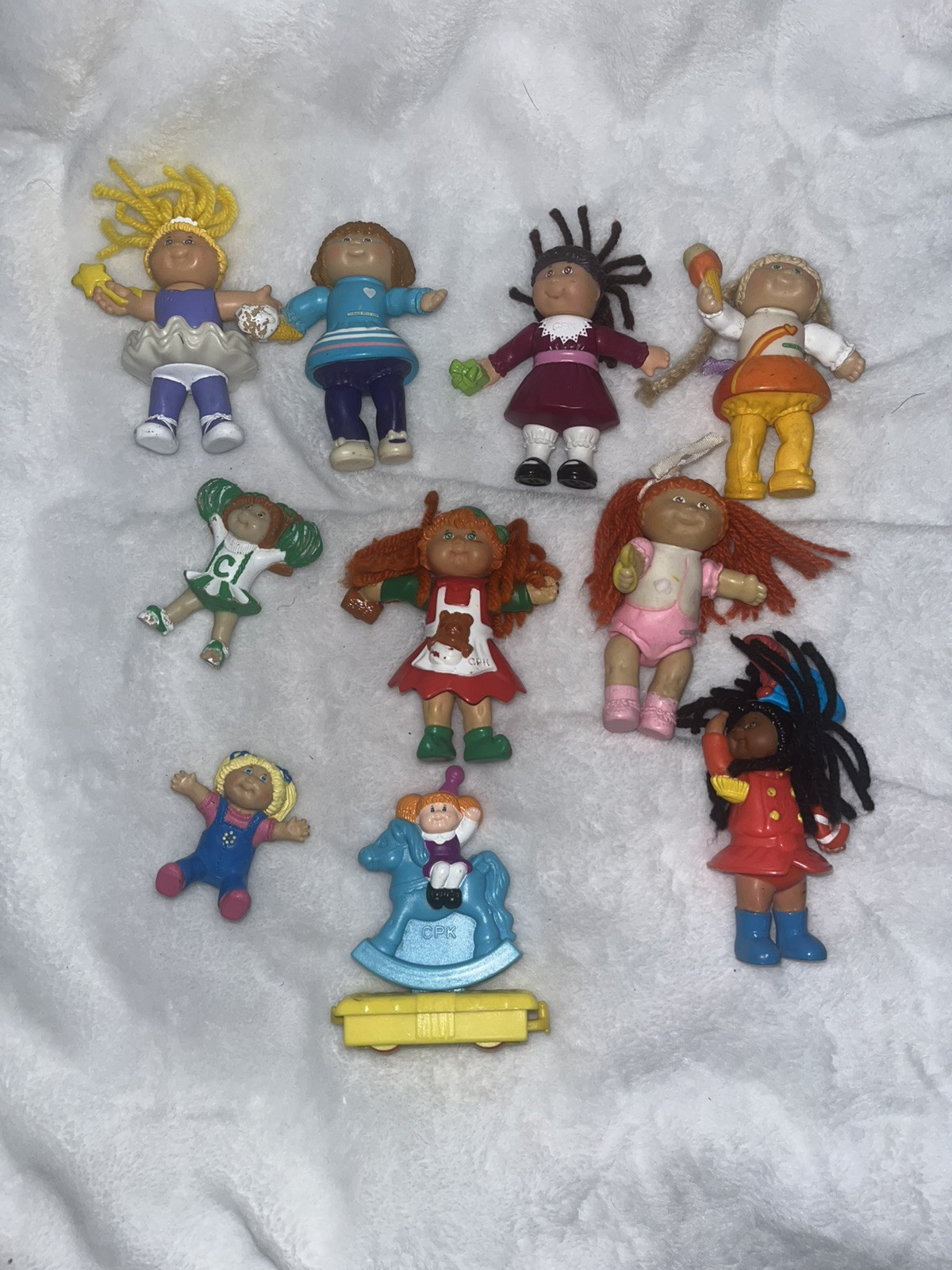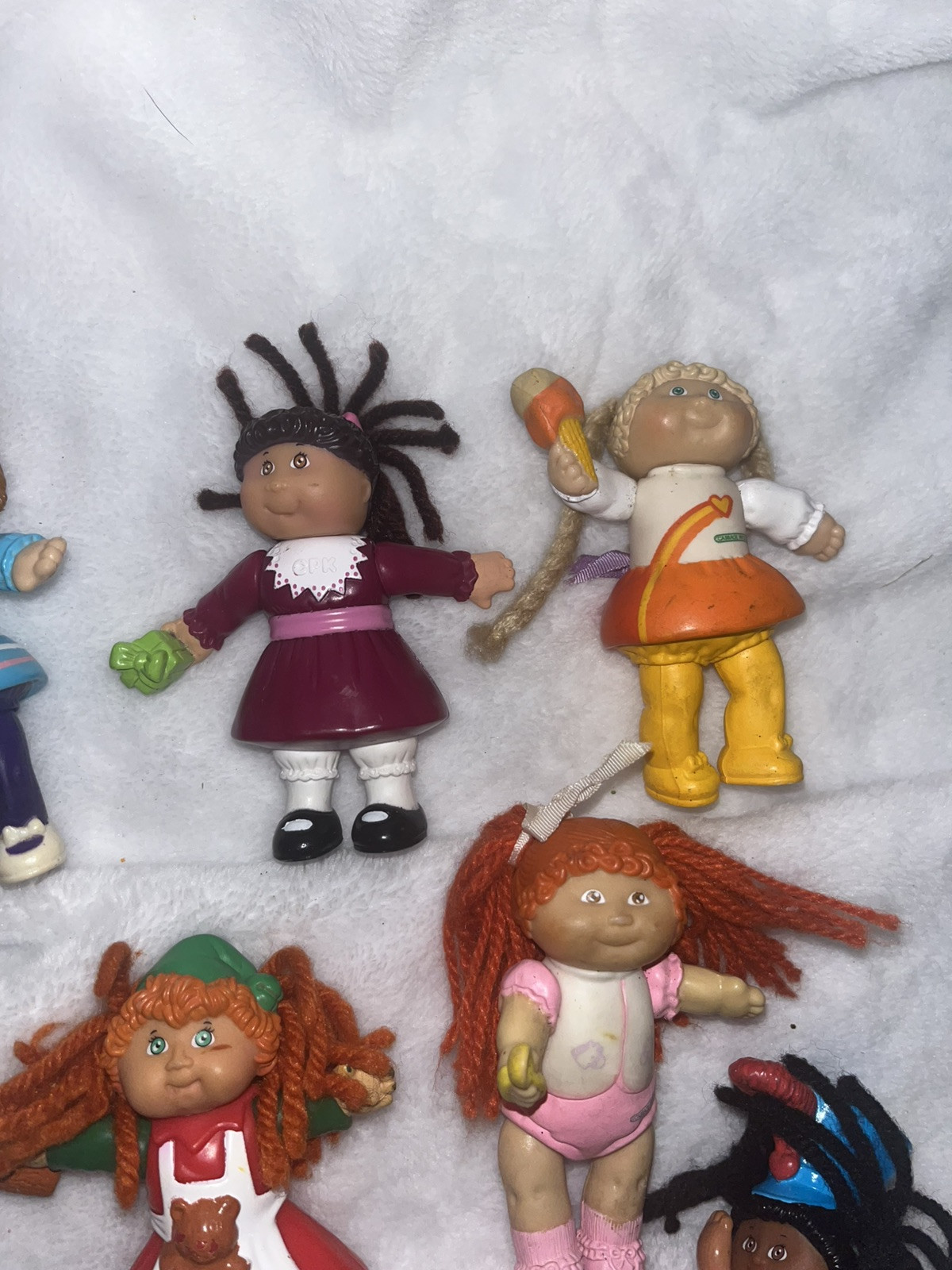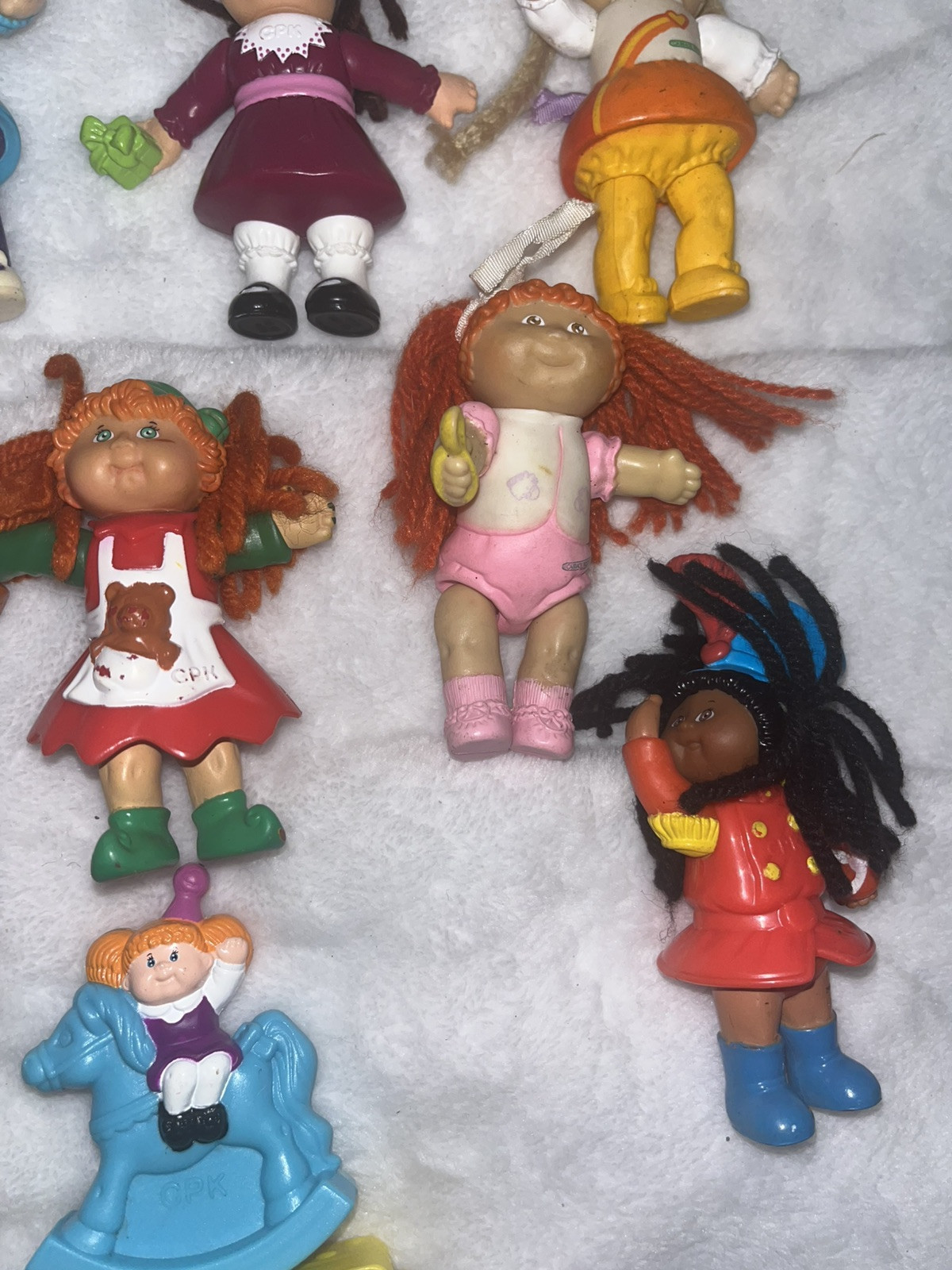 Vintage Lot Of 9 Cabbage Patch Kids PVC Mini Posable Figurines from 1984 and up. These 3.5" figures feature orange & yellow hair, blue & green eyes, and varying complexions. Made of vinyl, hard plastic, and plastic, these original 1980s collectibles are great for all occasions. Made in China, these nostalgic pieces are a must-have for Cabbage Patch Kids enthusiasts.