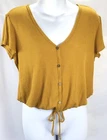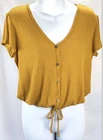 Free Kisses Top blouse S gold V-neck tie waist short sleeve. Chest 38 " (underarm seam to seam x2) Length 18 " (front shoulder to hem) Excellent Fashion Gem Fast shipping , same or next business day with tracking number for confirmation Thank you Questions? Please let me know I answer questions promptly Have a great day! WalkupandDeal offers great deals on previously loved items....... We inspect each garment for any flaws the item may have: missing buttons,holes,spots,tears or pilling. Our suppliers are carefully selected, so we only offer items that are in Great with minimal wear ,excellent,nearly new or New with tags condition. Information on each item can be found in the "item specifics" tab, including: Size, measurements,fabric content and care instructions. Our faculty is a non smoking environment and each item is laundered & steamed prior to listing and shipping. We strive for every customer to be happy with their items and as always offer a "return for any reason" policy...... ..... Thank you for shopping with us!!!