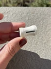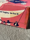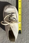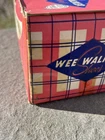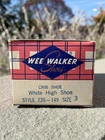 These vintage Wee Walkers baby shoes are a rare find for collectors and enthusiasts alike. The shoes come in their original box from 1960 and include a shoe plastic screw top bell. The white leather material and vintage look make these shoes a stylish addition to any collection. The shoes are perfect for everyday wear and are a great conversation starter. They have been worn and loved. There is a bell included that appears to be intended to clasp onto the laces. The box has tape on one edge. See pics.