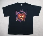 Get into the Halloween spirit with this vintage Y2K t-shirt featuring a fun and spooky graphic of a jack-o-lantern pumpkin. The black tee is made of high-quality materials and is designed to provide comfort and durability. It is available in a men's regular size large and is perfect for any Halloween occasion. The Delta brand t-shirt is a great addition to any Halloween wardrobe and is sure to make a statement.