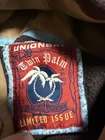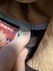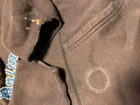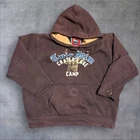 This vintage Y2K Union Bay hoodie sweatshirt in size XL features a brown color with a graphic print of a dragon and tribal design. It has long sleeves, a drawstring closure, and is made of a polyester and cotton blend knit fabric. The hoodie has a relaxed fit with a hood, pockets, and a distressed look, making it perfect for winter, fall, and spring activities like walking, skateboarding, and hiking. Distressed stains cut sleeves rips. Nice fading