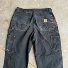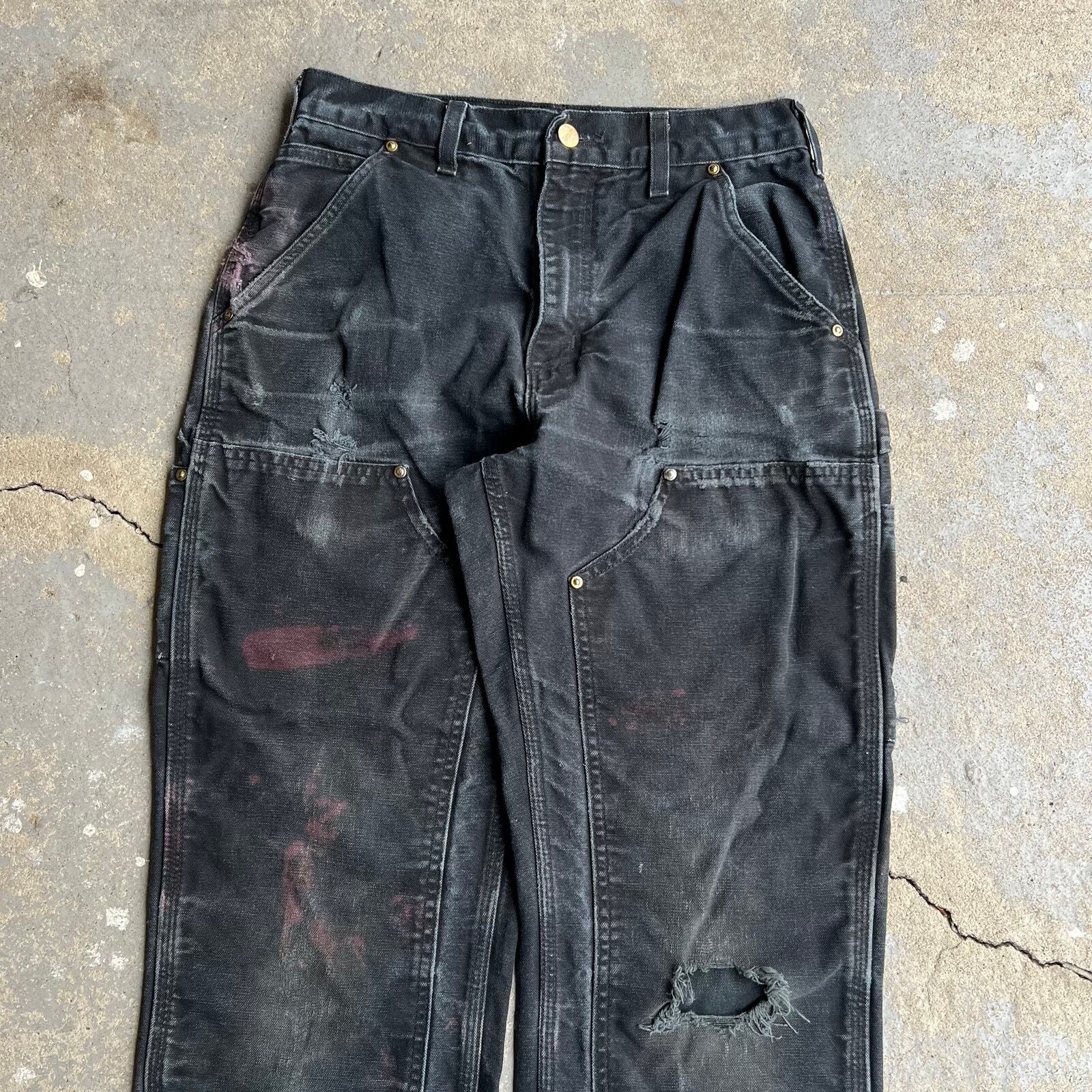 Vintage carhartt faded black distressed double knee work wear carpenter pants. Really good pair. Have some bleach marks but overall amazing wear on these ones. Measure 28x30 and a 8.5 leg opening. Please check measurements before purchasing. I do my best to show any flaws in pictures. Quick shipping! Bundles encouraged! @ants_haul on Instagram. 35!!!