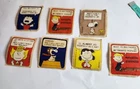 Vintage lot of 7 Peanuts bookplate stickers including two of snoopy, 2 of Lucy, one of sally, and two of the same sticker with Schroeder. They are about 3 inches in size. There is some discoloration from age.