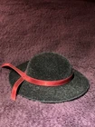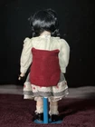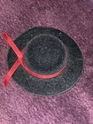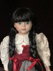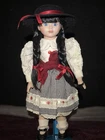 16-inch tall doll with a light complexion, dressed in a white button-up long-sleeve top with red buttons and a skirt featuring a black-and-white checkered pattern with floral details. The doll has two braids and wears a black cartwheel hat with a ribbon, along with a red wool sweater tied around the waist.