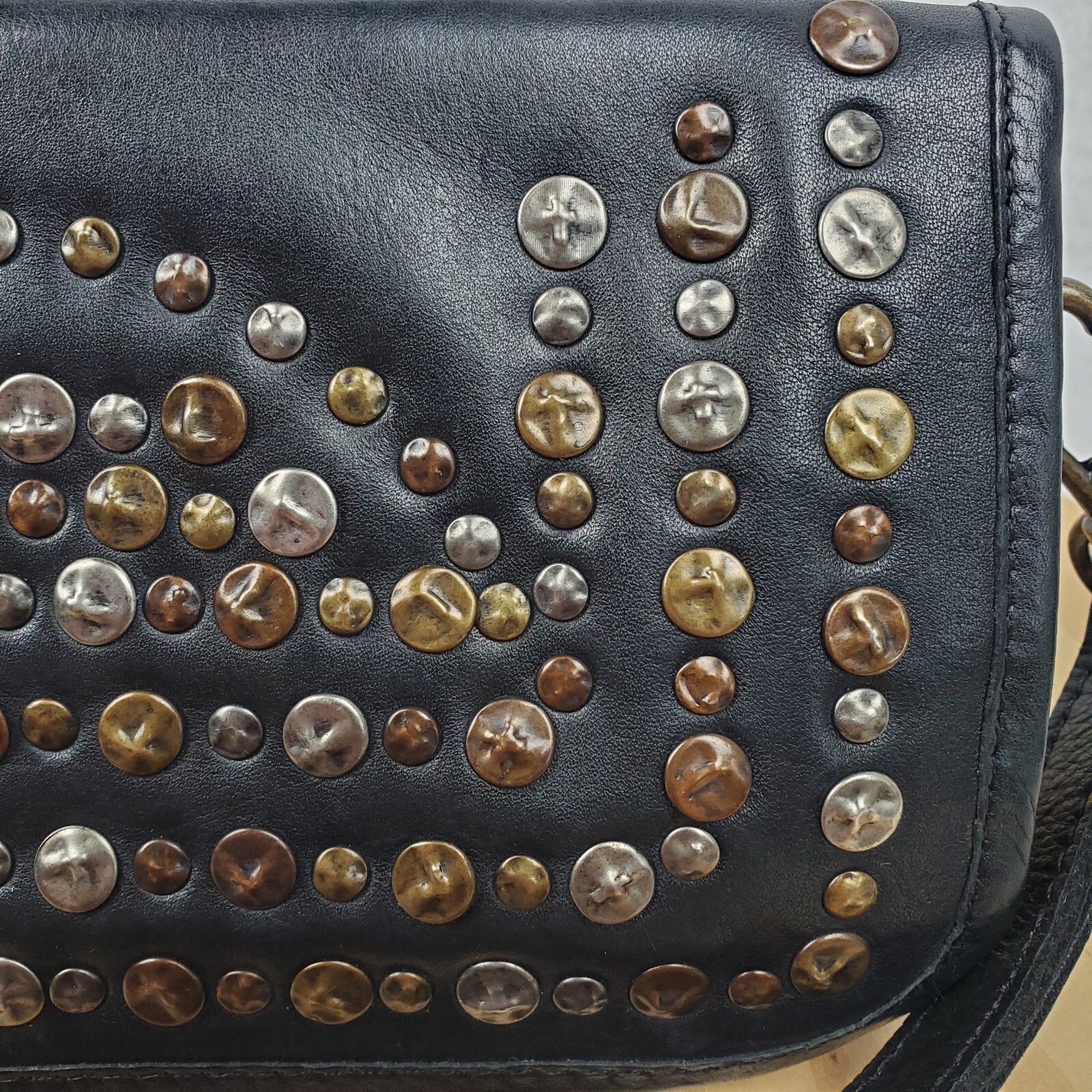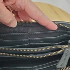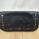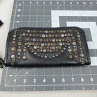 Viola Castellani Italian Soft Black Leather Studded Zip Around Wallet Wristlet Clutch Shows 2 spots to inside credit card slots from use/handling shown in pic #15, please view all pics. Does not effect function or design Approximate Measurements: Height: 4.5 in Width: 9 in Depth: 1 in