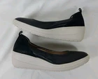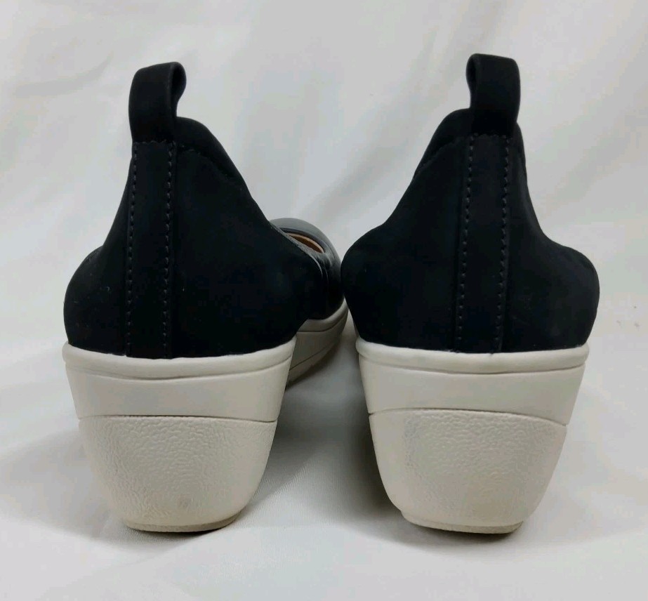 Vionic Jacey Wedge Shoes Womens 7.5 Black Leather Comfort Slide Comfort. Arch support removable insoles, leather upper, suede back. In excellent condition, minimal signs of wear, no repairs, no stains. Please check photos for more details.