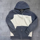 This is a vintage Volcom Stone sweatshirt in size Medium for men. It features a full zip design with a crew neck and long sleeves. The hoodie is made of a blue cotton blend knit fabric with a graphic print on the front. The style is slim fit, perfect for all seasons and can be machine washed. It has accents like a zipper and logo, making it a hipster, music, grunge-inspired piece suitable for activities like skateboarding.