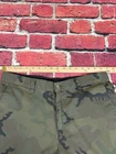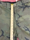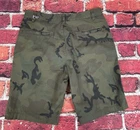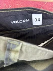 These Volcom Woodland Camo Shorts are a size 34 in green cotton/poly blend fabric. Featuring a camouflage pattern, flat front, and a regular fit, they have a 10-inch inseam and a 12-inch rise. Perfect for travel or casual wear in summer, fall, or spring, these cargo shorts have easy-care, breathable fabric with pockets for convenience. The design includes army, ripstop, outdoor, metal, classic, and hip hop themes.