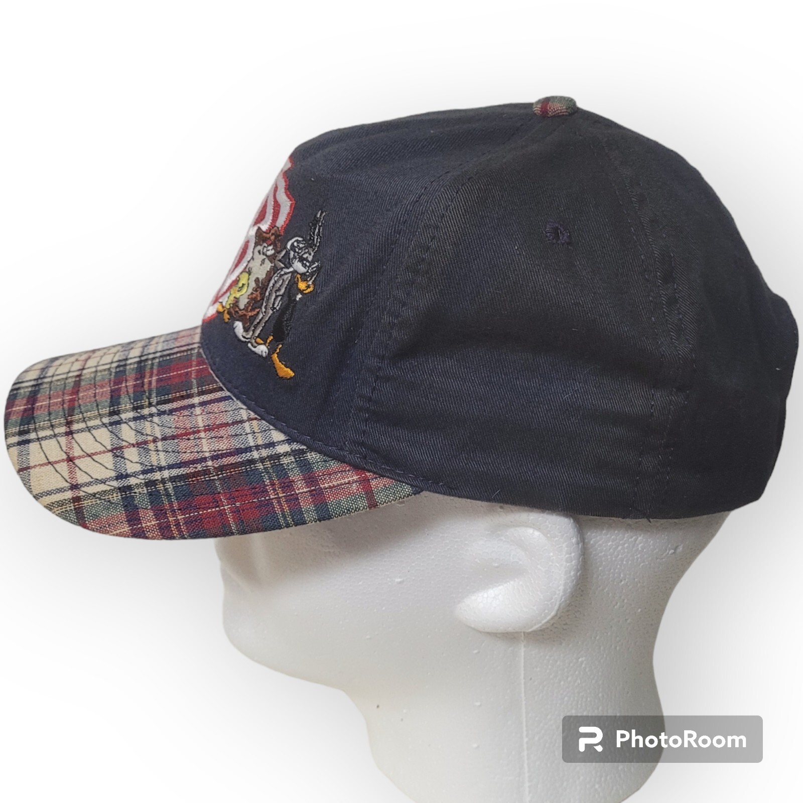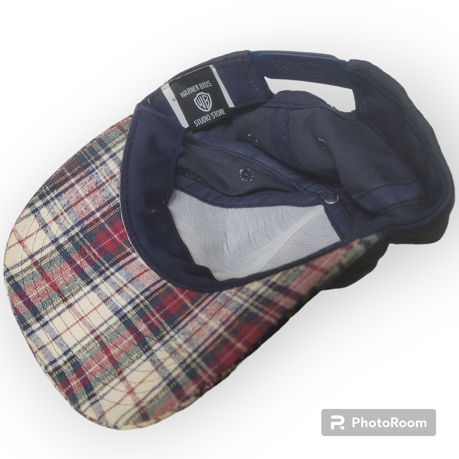 This vintage Warner Bros Looney Tunes baseball cap features a fun plaid design and embroidered characters including Bugs Bunny, Daffy, Sylvester, Porky, Tweety Bird, Foghorn Leghorn and Taz. The one size fits all cap is made with lightweight cotton canvas material and is adjustable for a comfortable fit. The navy blue cap is perfect for both casual and workwear occasions. It comes to you in excellent pre-owned condition and very stylish embroidered 90s style large graphic. Get your hands on this one today.