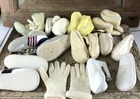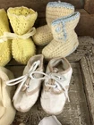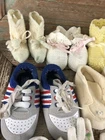 Vtg Baby Or Doll Booties Shoes Knit Crocheted Lot Gloves Sneakers Lot 10 Great lot of vintage baby shoes and knit booties. There is an adorable pair of baby knit gloves too. Some signs of age. See all pictures. The leather white shoes have loose buttons on them so I recommend sewing them on a little tighter.