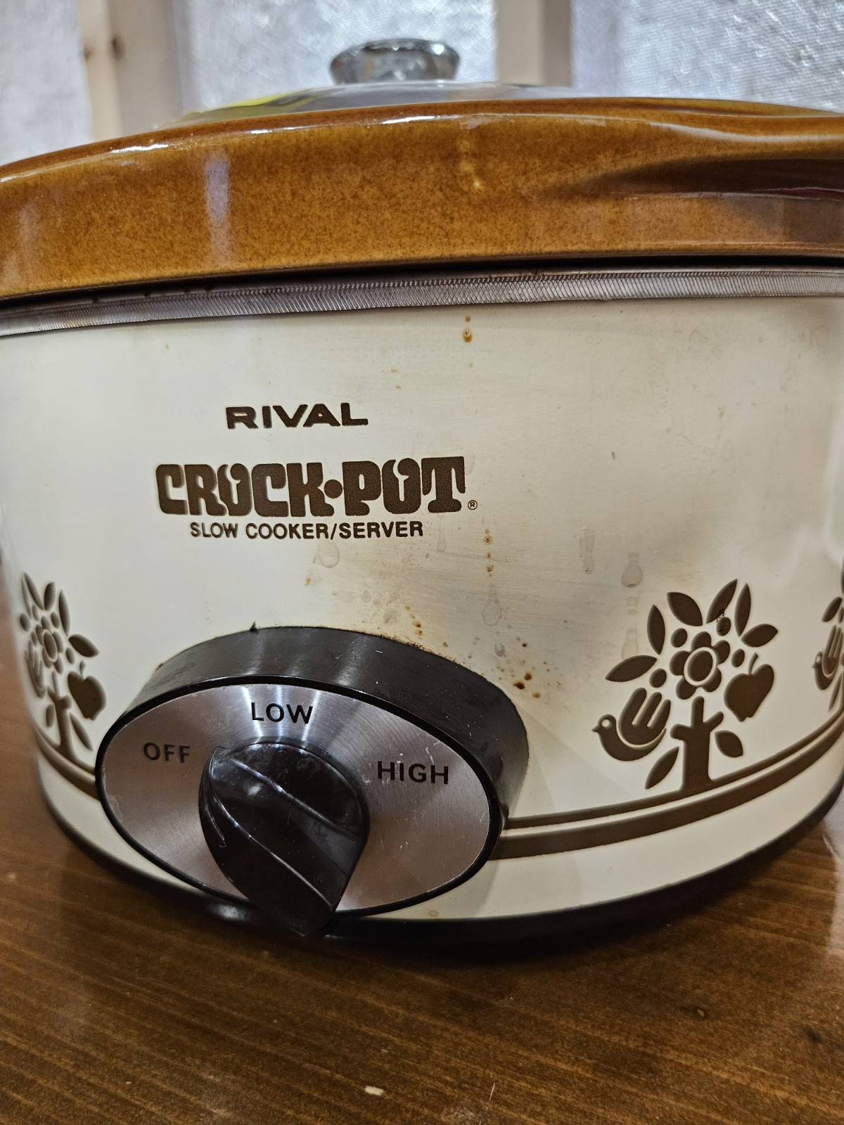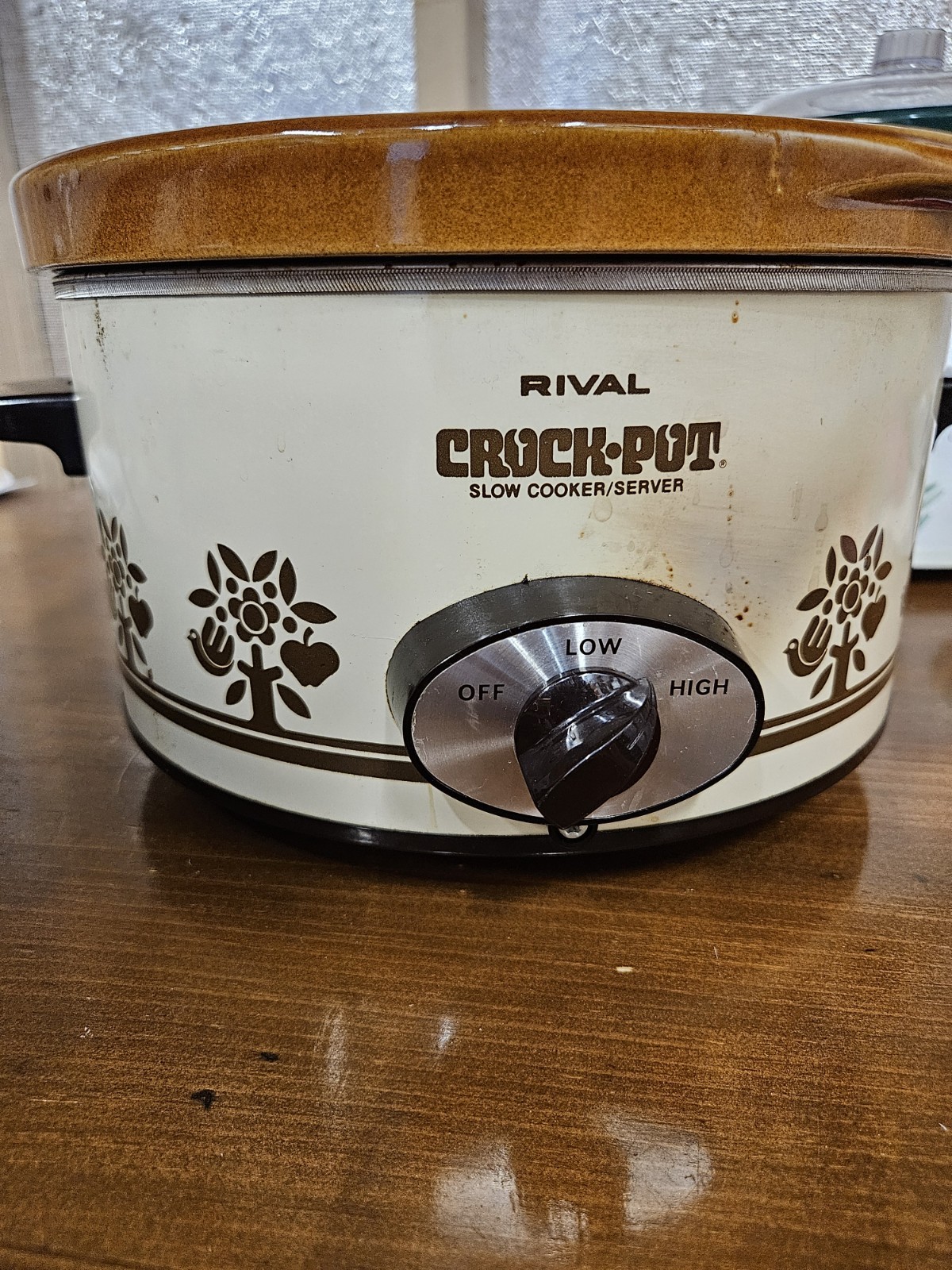 Just needs slight cleaning, some spots on outside need wiping/scrubbed off. Has been tested. The Vtg Rival Crock-Pot Slow Cooker is a charming addition to any retro kitchen, with its brown color and floral bird design. This 4 Quart slow cooker is made of durable stoneware and features a glossy finish. It has a power source of 160W and operates with three settings/programs. This electric slow cooker is portable and easy to clean, making it a convenient and stylish appliance for your home cooking needs.