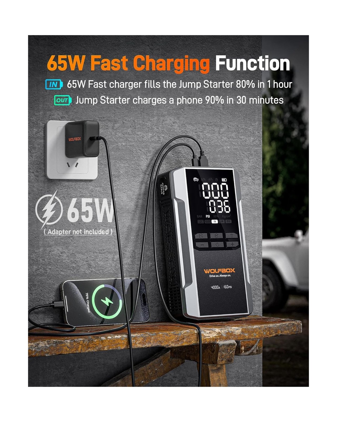 WOLFBOX 4000A Jump Starter with 160PSI Air Compressor, 12V Car Battery Booster, 65W Fast Charge, 24000mAh Portable Tire Inflator, LED Display for 10L Gas & 10L Diesel Engines, LED Light, Jumper Cables Description Features: Newly Upgraded All-in-one Jump Starter and Air Compressor - Built-in 24000 mAh battery and a peak current of 4000A, it can start a completely dead 12V car battery (up to 10L gas or 10L diesel engines). It can also inflate the tires of pickup trucks and below, combining multiple functions in one device 65W Fast Charge - With USB-C 65W port, USB-A ports (12W/18W) and upgraded 160W DC continuous output, it can be fully charged in as fast as two hours. It's also a 24,000 mAh mobile power bank, ready to power tablets, phones and other devices Inflate a Pickup Truck in 2.5 Minutes - With a powerful 45 liter per minute (160 PSI) motor, it takes just 2 minutes 30 seconds to inflate a 315/70 R17 pickup truck tire from 30 PSI to 36 PSI, and 1 minute 20 seconds to inflate a 275/70 R17 SUV tire, making quick work of insufficient tire pressure Booster & 400 Lumen Lights - Offers a powerful booster for starting vehicles in low voltage conditions and is 3-5 times brighter than typical equipment with its 400-lumen LED flashlight. Includes distress, strobe, and high beam modes, making it an essential emergency device Operates down to -4F & 10 Types Protections - The portable battery jump starter with air compressor, rated at IP64 for protection, ensures resilience in harsh environments. Operates at -4F and survives the cold Product Details: Brand: WOLFBOX Product Dimensions: 2.17"D x 5.28"W x 9.37"H Item Weight: 5.3 Pounds Amperage: 600 Milliamps Peak Output Current: 4000 Amps Brand: WOLFBOX Product Dimensions: 2.17"D x 5.28"W x 9.37"H Item Weight: 5.3 Pounds Amperage: 600 Milliamps Peak Output Current: 4000 Amps Manufacturer: WOLFBOX Automotive Fit Type: Universal Fit Model: MegaVolt24 Air Item Weight: 5.3 pounds Item model number: megavolt 24 air Batteries: 1 Lithium Ion batteries required. (included) Manufacturer Part Number: MegaVolt 24 Air Date First Available: February 11, 2025 Delivery We Do Not Ship Outside of the Continental US. Return Policy All items qualify for returns within 30 days of receipt. Buyer is responsible for return shipping on any item that is not damaged. Feedback We take our reputation seriously, we buy and sell online, so we understand the value of trust. If you are unsatisfied with your order, please contact us and we will work with you to resolve it to your satisfaction.
