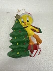 Celebrate the holidays with this vintage 2000 Christmas ornament featuring the beloved Looney Tunes character, Tweety Bird, wearing a festive Santa hat and perched on a tree. The multicolored ornament is perfect for any Looney Tunes fan and adds a touch of holiday cheer to your decor. Crafted with care and attention to detail, this small ornament is made of high-quality materials and features a hanging feature for easy placement. Whether you're a collector or just looking for a unique holiday decoration, this Looney Tunes ornament is sure to delight. Add it to your collection today!