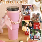 Features: Our water bottle lanyard is designed for water bottles and handle them securely in place to prevent them from accidentally slipping, making a nice addition for outdoors. Our bottle handle strap makes an ideal gifts for boyfriend or girlfriend, son, husband, wife, friend, coworker on birthday, Christmas, Thanksgiving, Easter, graduation season, wedding, Mother's Day and much more. Specifications: Material: Handle: silicone Scarves metal strap: scarves and metal Color: Handle: pink Polyester metal strap: striped pink Size: Handle: about 2.56 x 2.56 inches/ 6.5 x 6.5 cm, fit cups about 8-40 oz Polyester metal strap: about 12 inches in length Package includes: 1 x Water bottle handle with strap Notes: Manual measurement, please allow slight errors on size. The color may exist a slight difference due to different screen displays. Easy to Carry: the silicone water bottle handle makes carrying water bottles easy; Simply slip on the water bottle holder, and attach the cute and delicate pearl metal strap; Ideally sized about 2.56 x 2.56 inches/ 6.5 x 6.5 cm, it fit most 8-40 ounce water bottles, our water bottle handle is well compatible with Stanley Cup Quality Material: our water bottle handle with strap is compatible with Stanley Cup, and made of quality and reliable materials; The holder crafted from safe silicone material, which is not easy to break, serving you for long term; Our water bottle holder with strap is versatile and can be carried in your hand, or hang on bags, backpacks, strollers, chairs, wheelchairs, bikes, and more Water Bottle Handle for Beauty Compatible with Stanley Cup: the quality ABS pearl metal chain of our water bottle sling comes with a lovely shell pendant; The pearl metal chain is measuring about 12 inches in length; The pearl metal chain adds a pretty touch to your bottle, giving an exquisite appearance; The pearl metal chain isn't just a pretty addition, detach and use it as a stylish keychain or a bag accessory Buckle Handle: the strap of our water bottle carrier handle can be removed; You can use it with or without the buckle handle; You can untie the strap and secure the holder with other items according to your needs; Impart style and convenience with the handle compatible with Stanley Cup, it's an ideal present for the modern individual Wide Application: this cup handle with strap is versatile, you can hold it in your hand or attach it to items such as backpacks, wheelchairs, chairs, bikes, etc.; It is a practical accessory, ideal for walking, hiking, camping, sports and other outdoor activities; This water bottle holder compatible with Stanley Cup gives you a more convenient experience; Please confirm the size before purchase