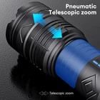Description: 1. White laser: high-power LED wick, high bright light irradiation distance to easily light up the night to meet your lighting needs 2. Explosive bright floodlight: large range of irradiation, search tools, the darkness all away 3. Multi-function: intelligent electric display / can be recharged at any time 4. Fast cooling lamp body: shark fin multi-segment cooling system to protect the lamp body, greatly extending the life of the flashlight 5. Five-speed mode: multi-speed induction dimming, effective against the night complex environment Product parameters: Model: Long models Battery: 4 sections Gear: strong light / medium light / low light / SOS / flashing zoom: air pressure telescopic zoom Function: Intelligent electric display / can do rechargeable treasure Product List: Flashlight * 1 Reflective straps * 1 USB data cable *1