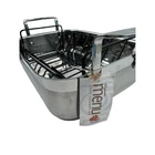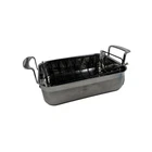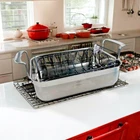 This Wegmans Menu Chef Collection Small Open Roaster Pan is a versatile addition to any kitchen. It is compatible with electric, and gas stoves and comes in a two-piece set with a roasting rack. The pan has a rectangular shape with a silver color and is made of stainless steel material. The 14" diameter pan has a 3.75" height and a 3" depth, with a width of 9.75". It features an easy-clean and dishwasher-safe design, making it convenient for everyday use. The surface coating is also made of stainless steel, ensuring that it is oven-safe and durable. This roaster pan is perfect for cooking a variety of dishes and is a great addition to any home cook's collection. The pan is brand new with tags.