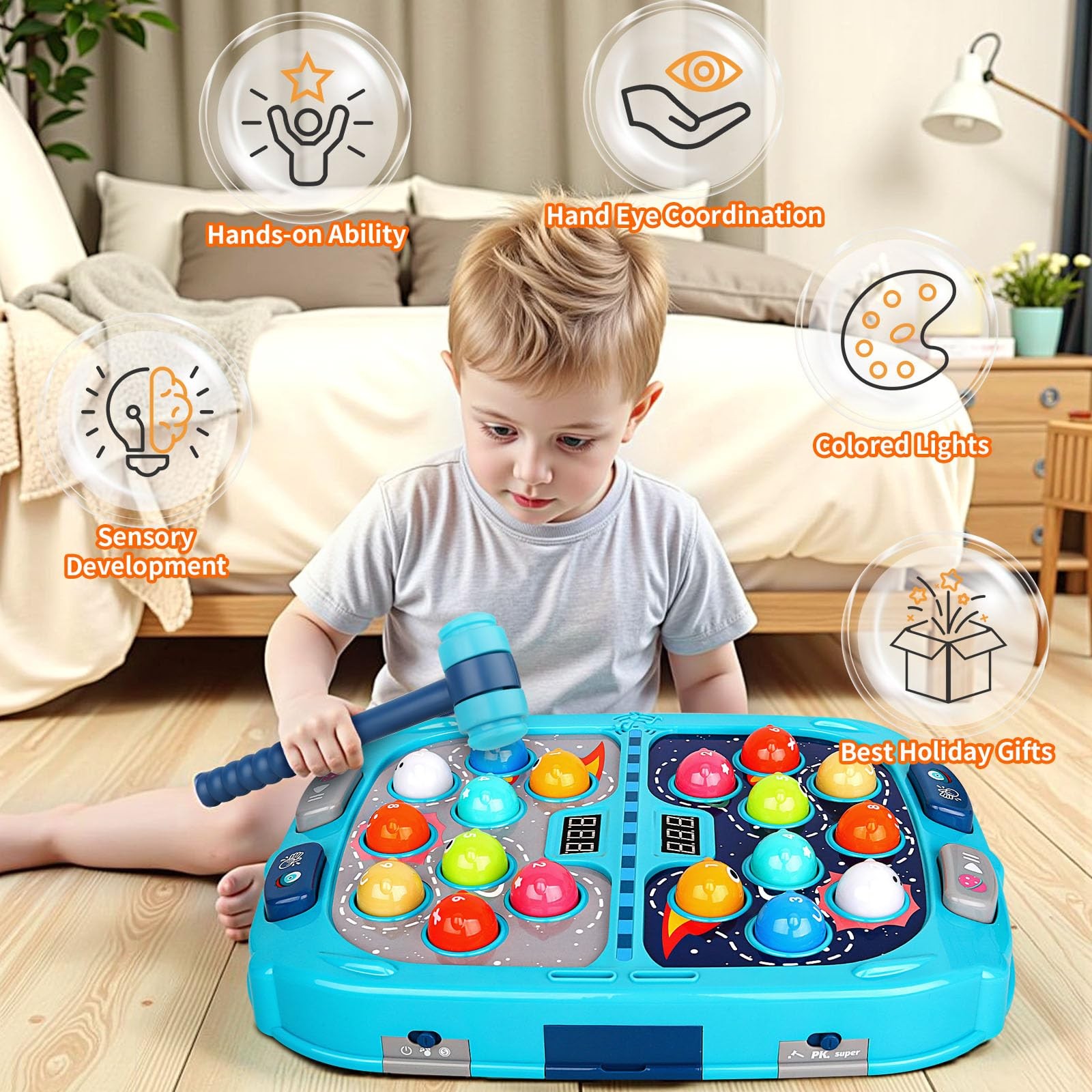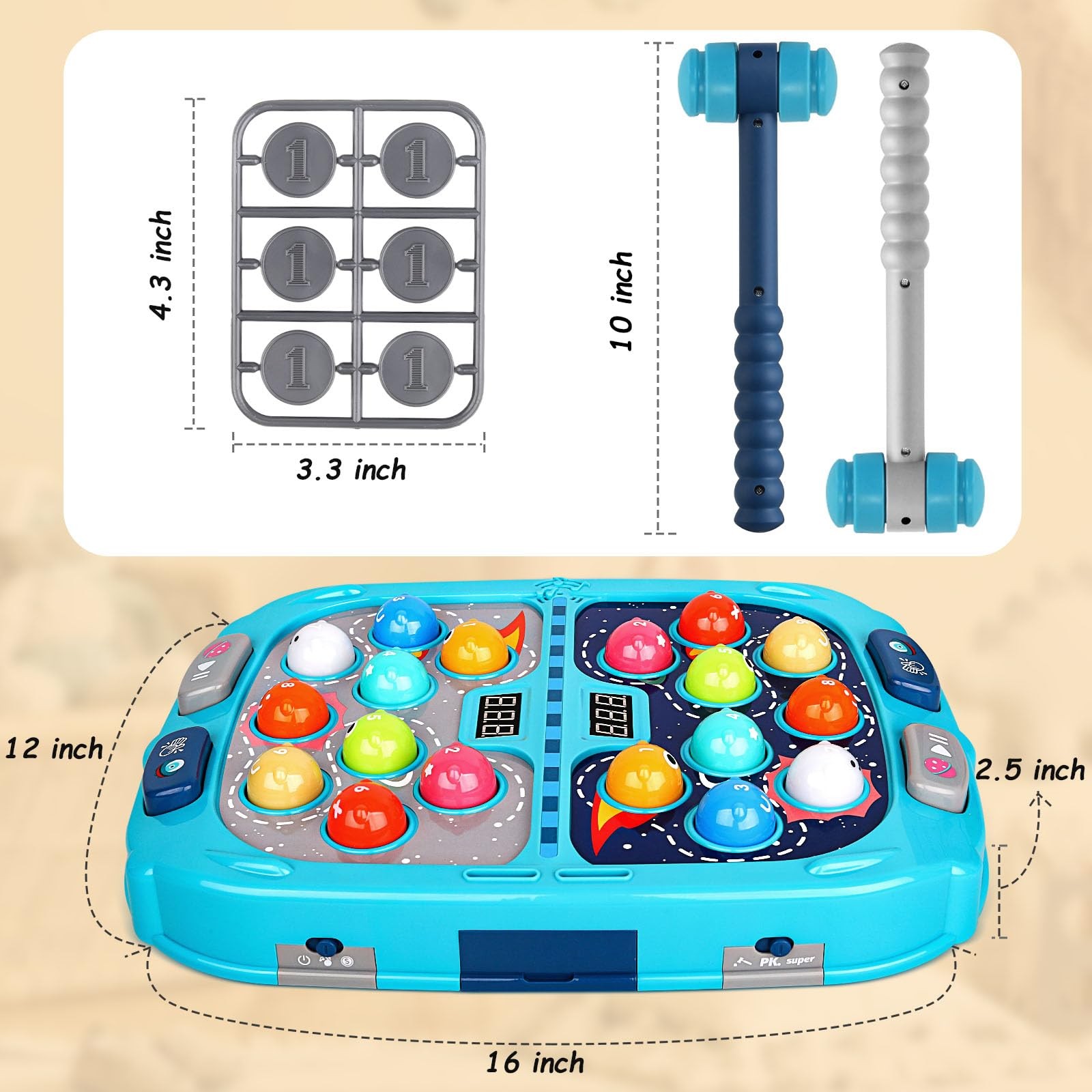 Q: Does it require batteries? A: Yes, it requires 4 AA batteries which are not included. According to the product information, the whack game mole operates on battery power. Q: What skills does it help develop? A: According to the product description, this whack-a-mole game helps develop fine motor skills, hand-eye coordination, brain development, cooperation, focus, reaction time. Q: What is the recommended age range? A: According to the product information, the recommended age range for this toy is 3 years and up. The Whack Game Mole is designed to help children develop fine motor skills, hand-eye coordination, brain development, attention, and cooperation through interactive play. Q: Is it easy to set up? A: Based on the product information, the toy is described as very easy to use, suggesting that it is likely easy to set up. Q: Can more than play at once? A: Yes, it is designed for multiple players. According to the product information, it has a -player mode that allows parents and to play together. Engaging Multi-Level Action: Dive into our whack a mole game featuring a super-sized 12”x16” playfield, 2 soft & safe hammers, 18 cute balls, and 2 score displays. conquer 9 exciting speeds and 45 progressively challenging levels. large score displays track the fun competition, perfect for toys for 3 year old boys and toys for 4 year old girls learning numbers. Requires 4 AA batteries (not included) Sensory Adventure Play: Watch colorful balls light up and hear playful sounds with every successful whack! Rhythmic music and vibrant flashing create an immersive, joyful atmosphere. This dynamic sensory experience instantly captivates children, making it a top pick among toys for ages 2-4 boys and girls seeking exciting discovery. Developmental Fun & Friendly Competition: More than just thrills, it builds essential skills! Whacking targets hones fine motor skills, hand-eye coordination, brain development, cooperation, focus and reaction time.Designed for toys for ages 5-7 girls and boys, it encourages healthy competition with friends or parents using the included soft-tip hammers. Ultra-Safe & Durable Build: The Tested to meet US ASTM F963 toy safety standards.Parent-approved safety is paramount. Soft rubber mallet tips prevent bumps, while super-sturdy plastic withstands enthusiastic play. Four powerful suction cups anchor it firmly to any table, preventing slips. Featuring smooth, non-edges, it’s ideal toys for 3 year old boys and all young adventurers. The Ideal Gift Hit: Ready to delight! This vibrant, interactive game is the birthday, Christmas, Easter, or Halloween gift for boys and girls aged 3-12. Great for parties, family game nights, or solo play, it combines fun and learning – guaranteed to be a cherished present for toys for 4 year old girls and of all ages.