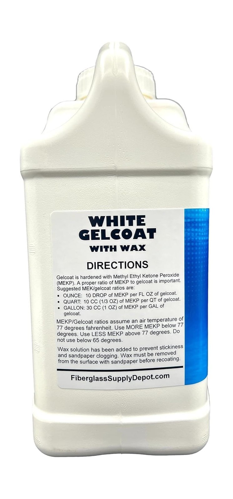 Fiberglass Supply Depot White Gelcoat with Wax Interior or Exterior - Gallon with 60cc Hardener (MEKP) Description Features: Exterior NPG/ISOPHTHALIC Grafted Polymer Backbone White, Comes with Hardener, Measuring Cup and MEK P Catalyst Chart 1 Gallon covers approximately 100 square feet Exceptionally easy patch & repair properties, user-friendly application properties Good water and blister resistance High strength and hardness & 5.5-6.5% elongation in tensile ( i.e. No more cracking!) High-viscosity has great coverage. Compatible with pigments made specially for polyester resin or gelcoat. Product Details: Item Package Dimensions L x W x H: 12.2 x 7.36 x 6.3 inches Package Weight: 5.63 Kilograms Brand Name: Fiberglass Supply Depot Color: White Manufacturer: HK Research Corporation Date First Available: August 29, 2017 Delivery We Do Not Ship Outside of the Continental US. Return Policy All items qualify for returns within 30 days of receipt. Buyer is responsible for return shipping on any item that is not damaged. Feedback We take our reputation seriously, we buy and sell online, so we understand the value of trust. If you are unsatisfied with your order, please contact us and we will work with you to resolve it to your satisfaction.