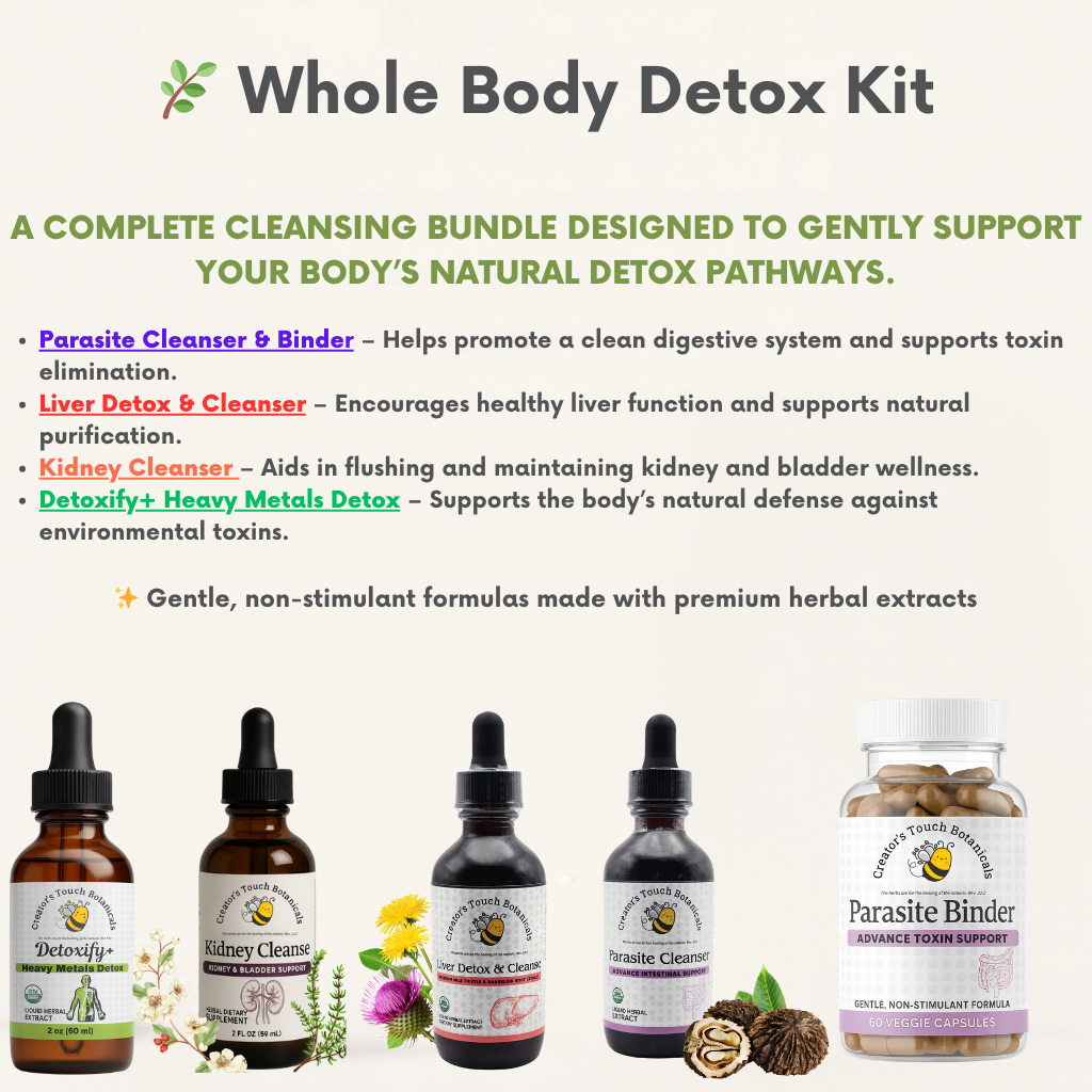 Whole Body Detox Kit Whole Body Detox Kit – Parasite Cleanser & Binder, Liver Cleanse, Kidney Cleanse, Heavy Metals Detox – 4 x 2oz + Binder Capsules Support your body’s natural cleansing process with this complete 5-in-1 detox system from Creator’s Touch Botanicals. Each kit includes: Parasite Cleanser (2 oz) – Helps promote intestinal balance & toxin elimination. Parasite Binder (60 capsules) – Captures and removes waste, supports digestion. Liver Detox & Cleanser (2 oz) – Encourages healthy liver function & detox support. Kidney Cleanser (2 oz) – Supports kidney & urinary tract health. Detoxify+ Heavy Metals Detox (2 oz) – Assists natural defense against environmental toxins. ✨ Why Choose Our Kit? Organic & wildcrafted herbs Gentle, non-stimulant formulas Complete system: cleanse, bind, and support Made in the USA | Non-GMO | Vegan friendly ⚠️ Important: Do not use all detoxes at once. Use one cleanse at a time, with 3–5 days rest between. Full instructions will be in included with kit. Size: Four 2 oz bottles + 1 capsule bottle