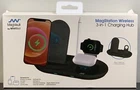 The Vivtar MagVault Wireless 3-in-1 Charging Hub is a black plastic charging station with a matte finish. It features a magnet mounting type and is compatible with various Apple devices, including the iPhone 12 series, AirPods, and Apple Watch Series 6/SE/5/4/3/2/1. The hub comes with a USB charging cable and user manual and supports wireless charging. It is designed for use on a desk or tabletop and complies with California Prop 65 Warning.