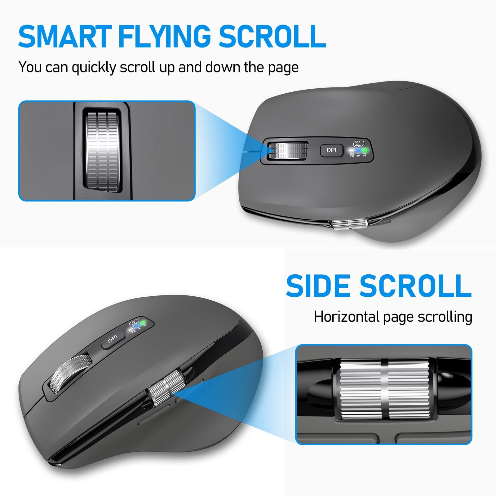 Wireless Bluetooth Side Scroll Mouse with Multi-device, Ergonomic Computer Mice with Smart Flying Scroll, Quiet Click For Windows/Mac OS/Chrome/Linux/Android Ergonomic mouse: Ergonomically designed mouse reduces hand fatigue. Its contoured shape with soft rubber grips, support you need for effortless control all day long. The side scroll wheel allows you to scroll the page left and right. Smart Flying Scroll: The metal roller design mouse with remarkable speed and near silence, allows you to quickly scroll up and down the page. Adaptive system, no need to switch Windows/MAC system manually. 4-level DPI: Settings (1000/1600/2400/3000) DPI to meet your multiple needs, either for daily work. Silent wireless bluetooth mouse can be used on any computer desktop and mouse pad. Move the mouse to wake up the screen. Multi-device and Multi-OS: This mouse is able to connect to 3 devices (2.4G USB+ Bluetooth*2) . You can switch between 3 devices with a single button clicking.Compatible with Windows, Mac OS, Linux, IOS, Android, Chrome OS. Applicable to Computer, Laptop,Tablet, MacBook, All-in-one PC, Smartphone, iPad. Long Battery Life: 2 AA batteries are included in the package, you can place 1 or 2 batteries to use (depending on your preference of mouse weight).1 battery can last up to 20 months and 2 batteries can last up to 40 months. (This varies according to the environment in which it is used.)