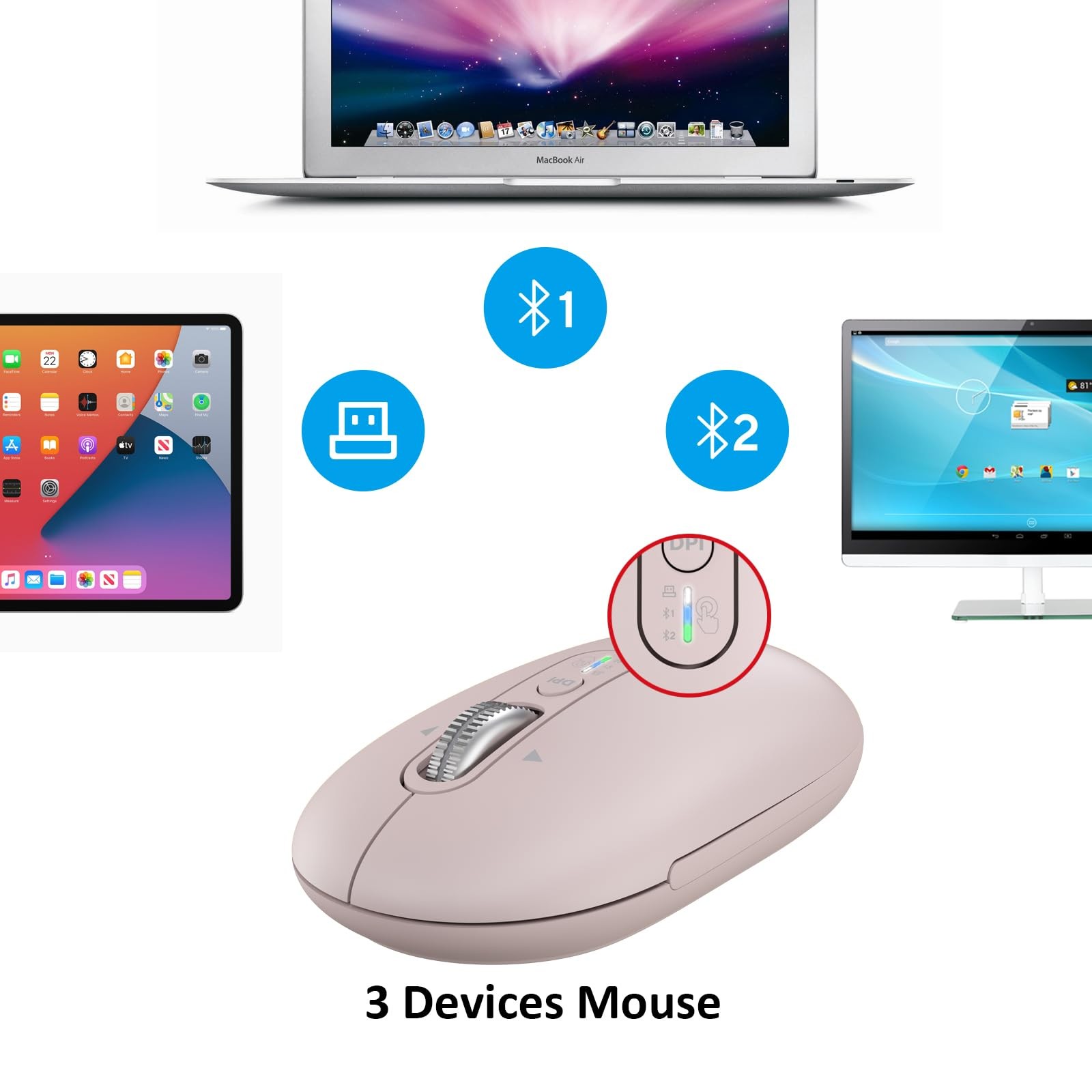 Engineered for excellence, this wireless slim mouse features dual Bluetooth 5.1/2.4GHz connectivity with LED indicators for seamless multi-device switching. Its stainless steel roller enables 4-way hyper-fast scrolling, and four adjustable DPI settings (1000/1600/2400/3000) ensure precise control. Silent click technology reduces noise by 90%, and its 20‑month battery life with auto sleep and on/off switch maximizes efficiency. Ergonomically designed for small‑to‑medium hands with an anti‑fingerprint finish. Package includes the mouse, USB receiver, AAA battery, manual. 【Seamless Multi-Connectivity】Plug&Play, experience effortless device switching with our dual Bluetooth 5.1 mouse and cutting-edge 2.4G Wireless Technology. With just one click of the mode switch button on the mouse, transition seamlessly between 3 devices—be it desktops, laptops, tablets, smartphones, Mac, and more. The integrated white, blue, and green LED indicators confirm active connections for 2.4G USB, Bluetooth Mode 1, and Bluetooth Mode 2 respectively, ensuring consistent, reliable, and convenient multi-device connectivity. (The 2.4GHz USB receiver is stored conveniently under the Magnetic Surface Cover—simply remove it when needed.) 【4-way Quiet Hyper-Fast Scrolling】Experience ultimate navigation with the Stainless Steel Roller Design Mouse. The wireless mouse's precision-engineered stainless steel roller not only enables rapid up and down scrolling but also allows smooth horizontal page sliding. Enjoy line-by-line accuracy for detailed document work and lightning-fast scrolling for extensive web pages—all delivered with a silent, clutter-free performance. 【4-level DPI & Silent Click】Customize your Precision and Movement Speed with four adjustable DPI presets (1000/1600/2400/3000) to suit every task—from intricate design work to swift Web Browsing and Gaming. This wireless mouse for laptops offers precise and sensitive cursor control on any surface, whether on a desktop or mousepad. Plus, its innovative noiseless click technology reduces noise by up to 90%, ensuring a quiet and distraction-free work environment. Perfect for Offices and Shared Spaces. 【Long-Lasting Battery Life & Auto Sleep Function】1 AA battery is installed in the mouse. Engineered for endurance with an impressive 20-month battery life, this wireless mouse is compatible with a wide range of devices—including Computers, Desktops, PCs, Macs, Phones, Laptops, Tablets, and even devices running Windows, macOS, Chrome OS, Linux, and iPadOS. The smart auto sleep function kicks in after just 5 minutes of inactivity, conserving energy until a simple click or movement instantly reactivates the mouse. An integrated ON/OFF switch further allows you to power it down completely when not in use, maximizing battery efficiency. 【Portable & Compact Design】Experience ultimate portability with our Slim Cordless Mouse, designed ergonomically for Small-to-Medium-sized hands. Its lightweight, slim profile and anti-fingerprint finish not only ensure maximum comfort and support during prolonged use but also make it easy to carry on travel. This compact design is perfect for on-the-go productivity without compromising performance. 【What You Get】The wireless bluetooth mouse includes: 1 x slim mice; 1 x 2.4GHz USB receiver(stored under the cover); 1 x AAA battery installed; 1 x instruction manual, and access to our friendly customer service.