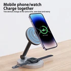 Features: 1. [2-in-1 wireless charging] Charging your phone/headphones together saves time and effort. 2. [Magnetic charging] Circular magnetic charging module, easy to release and precise positioning, suitable for iPhone 15/14/13/12 3. [Multi angle charging] The combination of magnetic suction wireless charging and bracket function allows for automatic alignment, wireless charging activation, and various viewing angles such as horizontal and vertical placement. 4. [Foldable] The angle can be adjusted, and when not in use, it can be adjusted to a folded state, which does not take up space and is convenient for travel and carrying. 5. [LED indicator light] Type-c connection port with indicator light, clear working status at a glance, ABS heat dissipation shell design, cold charging without overheating. Specifications: Input voltage: 9V 2A Mobile phone output power: 15W/10W/7.5W/5w Output current: 9V 1.5A 5V1A Transmission distance: 5-10mm Frequency 100-150KHZ Material: ABS+metal Interface: Typec 15 Watch output: 5V 0.35A Headphone box: 5V 0.35A Package List: Wireless charger * 1+Type-C connection cable * 1+manual * 1 On Jan 29, 2025 at 14:02:28 PST, seller added the following information: