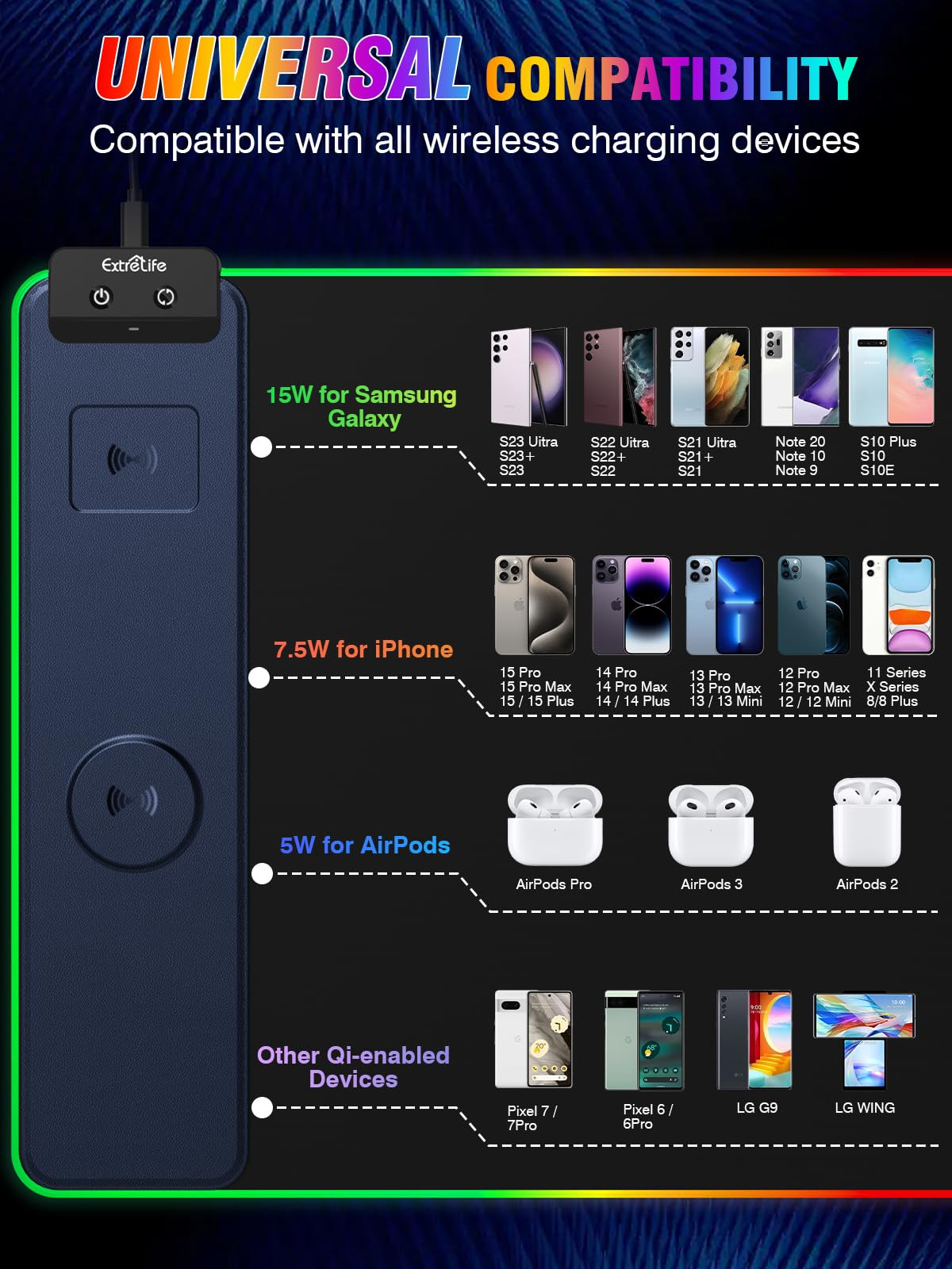 【The first 3 in 1 Wireless Charging Mouse Pad on the Market】 rgb gaming mouse pad combines 2 in 1 wireless charging station(iphone/airpods wireless charger), mouse pad into one. With dual pads charging surfaces, you can charge your iphone/Samung Phones and Airpods simultaneously without additional cables cluttering on your desk. Keep your desk organized and tidy. 【Built-in Magnetic Wireless Charging for iPhone Series】Support such as iPhone 16/16 Plus/16 Pro/16 Pro Max/iPhone 15/iPhone 15 Pro/iPhone 15 Pro Max/iPhone 15 Plus, iPhone 14/iPhone 14 Pro/iPhone 14 Pro Max/iPhone 14 Plus, iPhone 13/iPhone 13 mini/iPhone 13 Pro/iPhone 13 Pro Max, iPhone 12/iPhone 12 mini/iPhone 12 Pro/iPhone 12 Pro Max. Automatic alignment charging after placing the iphone mobile on the wireless charging plate. 【15W Wireless Charging Mouse Mat】 Fast wireless charge up to 15W for Samsung Galaxy Note 20/Plus,S23/S22/S21/S20; 10W for Samsung Galaxy S10,S9,S8, Note 10/9/8/7; 7.5W wireless charging for iPhone 16/15/14/13/12/11/X/8 series, New iPhone SE and standard 5W wireless charge for All wireless-charging-enabled phones, AirPods 3/2; AirPods Pro/Pro 2nd, and more. 【13 RGB Lighting Modes】 With 13 different light modes-2 dynamic modes and 11 static light modes, our RGB mouse pad lets you personalize your gaming setup. Choose your favorite color to create a visually stunning gaming experience. The memory function helps to remember your last light mode choice when switched on. 【 XXL Large Desk Mat】: This desk pad's size is 800x400x4 mm; it's large enough to provide an extended, comfortable surface for your keyboard mouse, and other accessories. Just keep your essentials within reach. Whether you need to store your pens, headphones, or other small items, this desk mat has you covered. 【Ultra Smooth and Waterproof Surface】 Our large extended keyboard mat features a smooth, textile-weave design for extremely precise mouse control and a smooth glide. Waterproof material can prevent damage from spilled drinks or other accidents. Won't have to be panic when you inevitably spill your drink. 【Non-Slip Rubber Base】 The soft and dense non-skid nature rubber base keeps this desk mat firmly in place. Just immerse into your work or games without worrying about the annoying mouse pad movement. 【What You Get】1*Wireless Charging RGB Mouse Pad, 1*Type-Cx1, 1*Manual. Please don’t hesitate to contact us if you encounter any problems, our friendly customer service will reply to you within 24 hours and offer you a satisfactory solution.