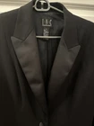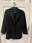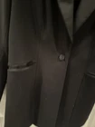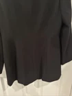 Beautiful blazer. Shell is 65% Rayon, 29% Polyester, 6% Spandex. Jacket is lined. Trim has satiny material on collar, 2 slit pockets. Sleeves measure 21" long. Exc condition