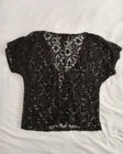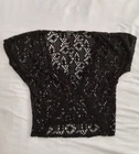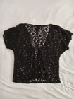 Elevate your wardrobe with this stunning black floral lace top by Love. The short-sleeved blouse features a V-neckline and a keyhole design, with scalloped accents and crochet details that add a touch of elegance to the piece. The top is made of a mixed media fabric that stretches to fit comfortably, and it is lined for added comfort and durability. Perfect for any occasion, this blouse can be dressed up or down, making it a versatile addition to your wardrobe. Whether you're going to a party, a wedding, or a casual outing, this top is sure to make you stand out. And with its neutral color and classic design, it's a piece that you can wear for years to come.