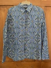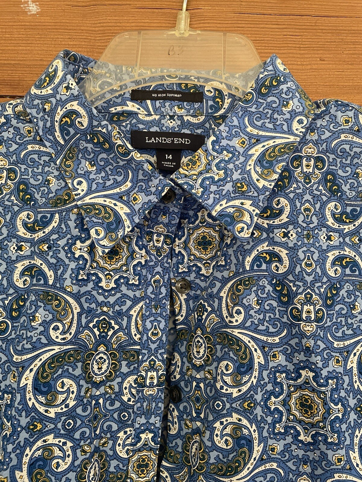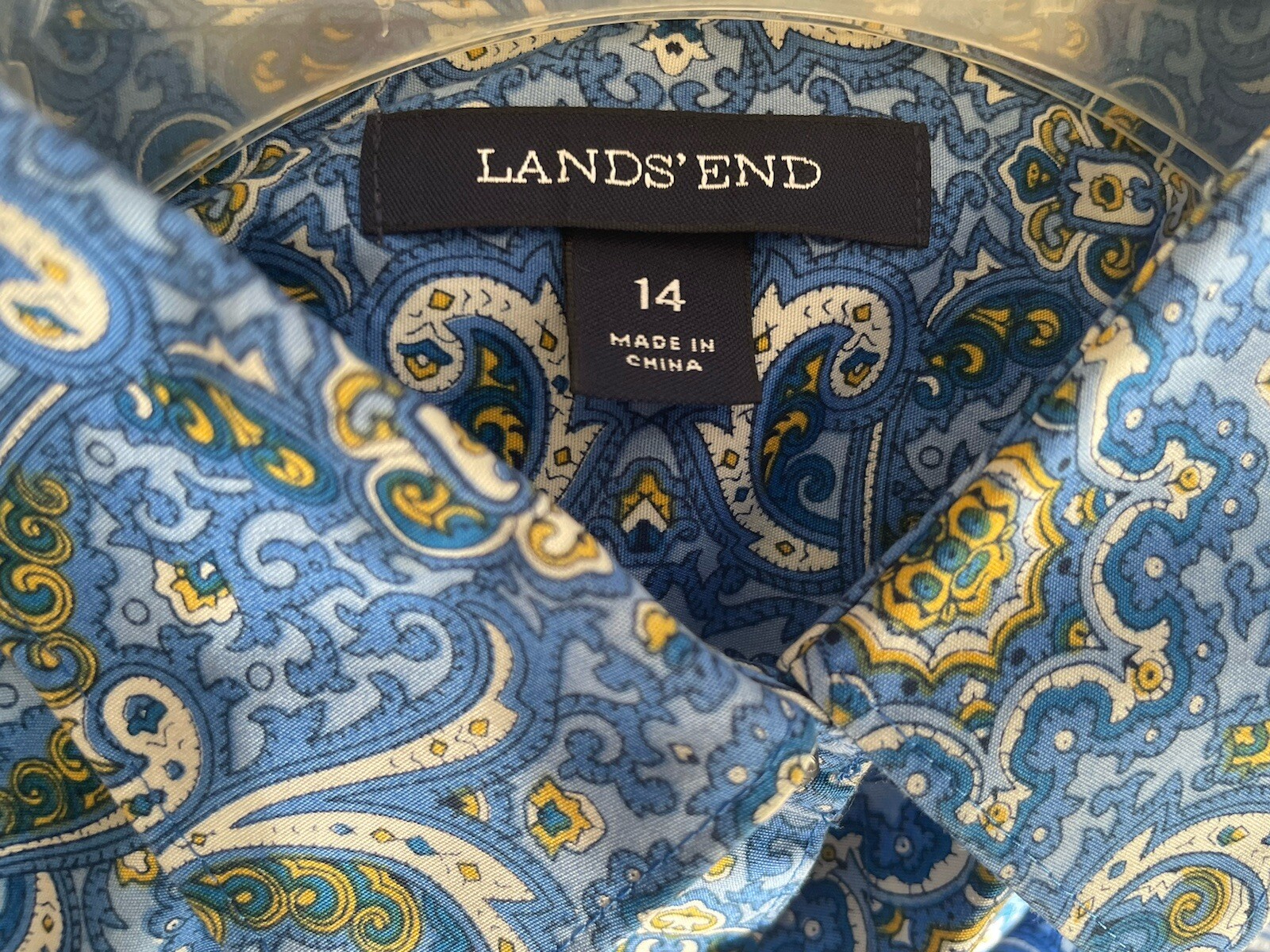 Beautiful blue and white print shirt from Lands End. Size 14. Point collar. Button front. Long sleeves with barrel cuffs. Back yoke. Curved hem. 100% cotton. Machine wash. Mint condition. Pit to pit 22.5 inches Sleeve length from pit to hem 19 inches Back length from neck to hem 27 inches