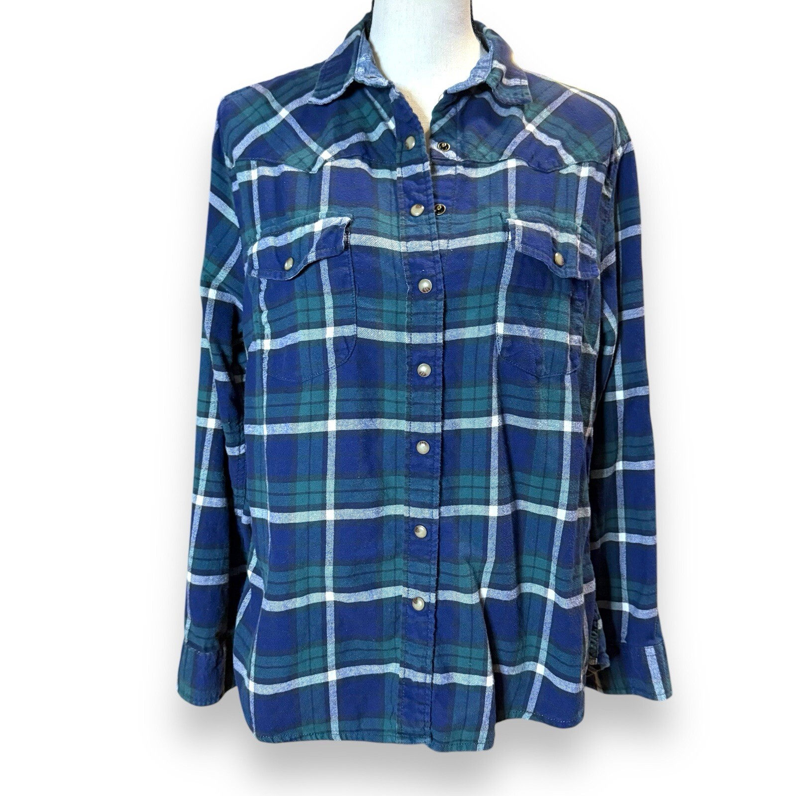Elevate your casual style with this comfortable and stylish green and blue plaid flannel shirt from Jachs Girlfriend. Made with stretch fabric, this women's medium-sized shirt features a collared neckline, long roll-tab sleeves, and snap closures for easy wear. Perfect for the fall and winter seasons, this flannel shirt is a basic piece that you can't live without. The shirt's plaid pattern adds a touch of character to your outfit, while the brand's quality ensures that you're getting a durable and long-lasting piece. Whether you're running errands or spending time with friends, this flannel shirt is the perfect addition to your wardrobe. It is in good preowned gently used condition with slight fading from wash wear. Otherwise, in great shape. B12