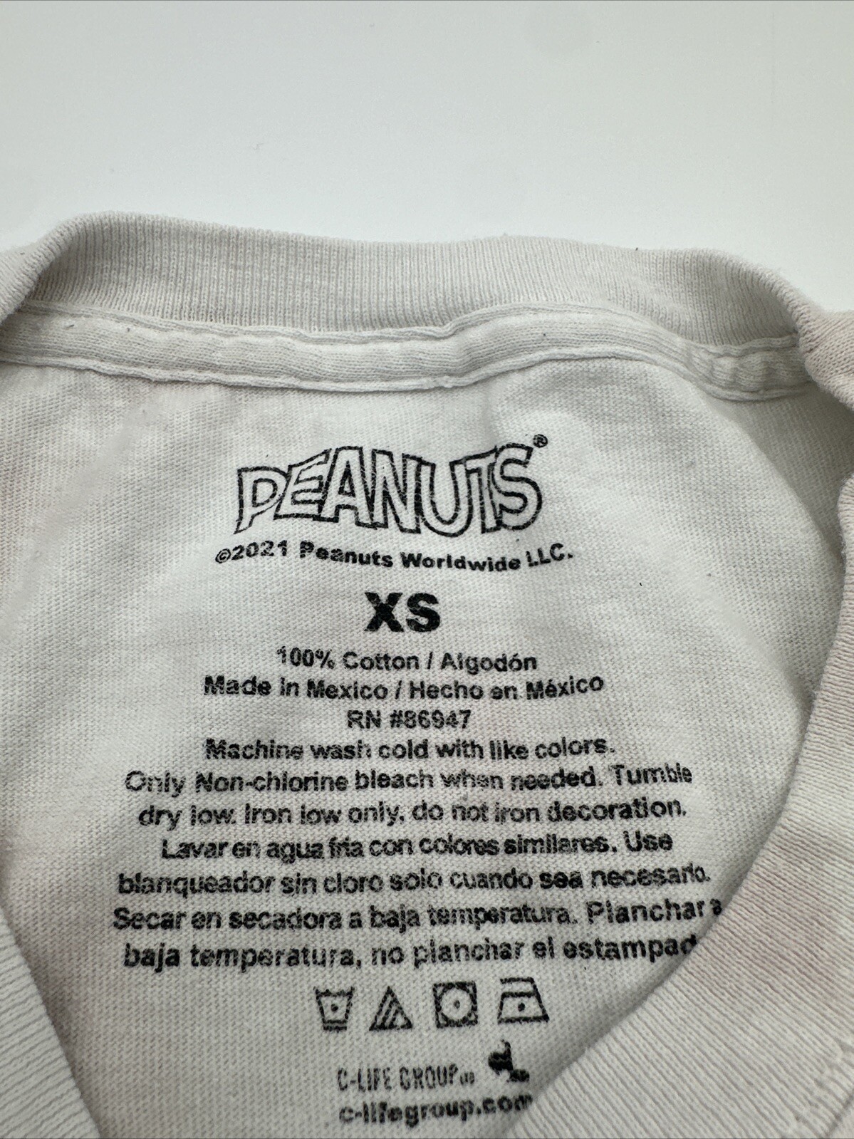 This is a Peanuts T-Shirt for women in size X-Small, featuring a graphic print of a Peanut character on a white cotton fabric. It has a crew neck, short sleeves, and a regular fit. The shirt is designed for casual wear and is easy to care for. It is a basic style with a classic Peanuts theme, made by the Peanuts brand in Mexico. *Check the images above for the flaws and measurements of the item.