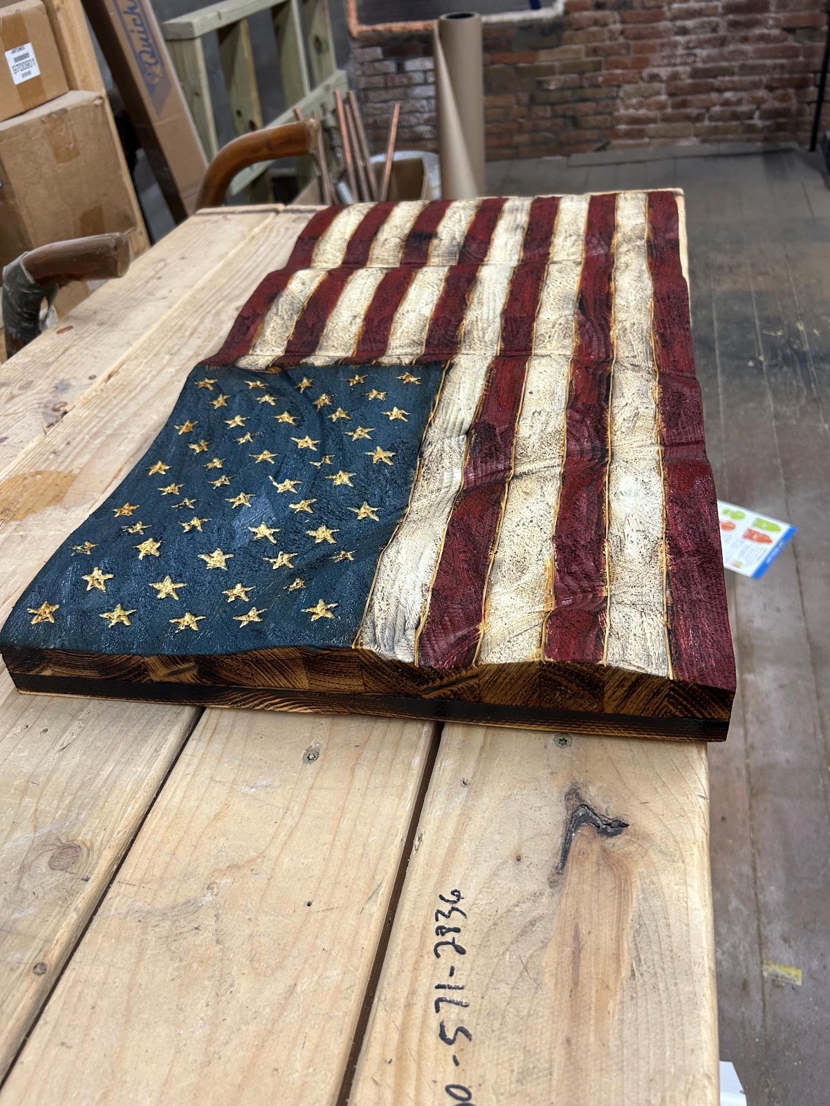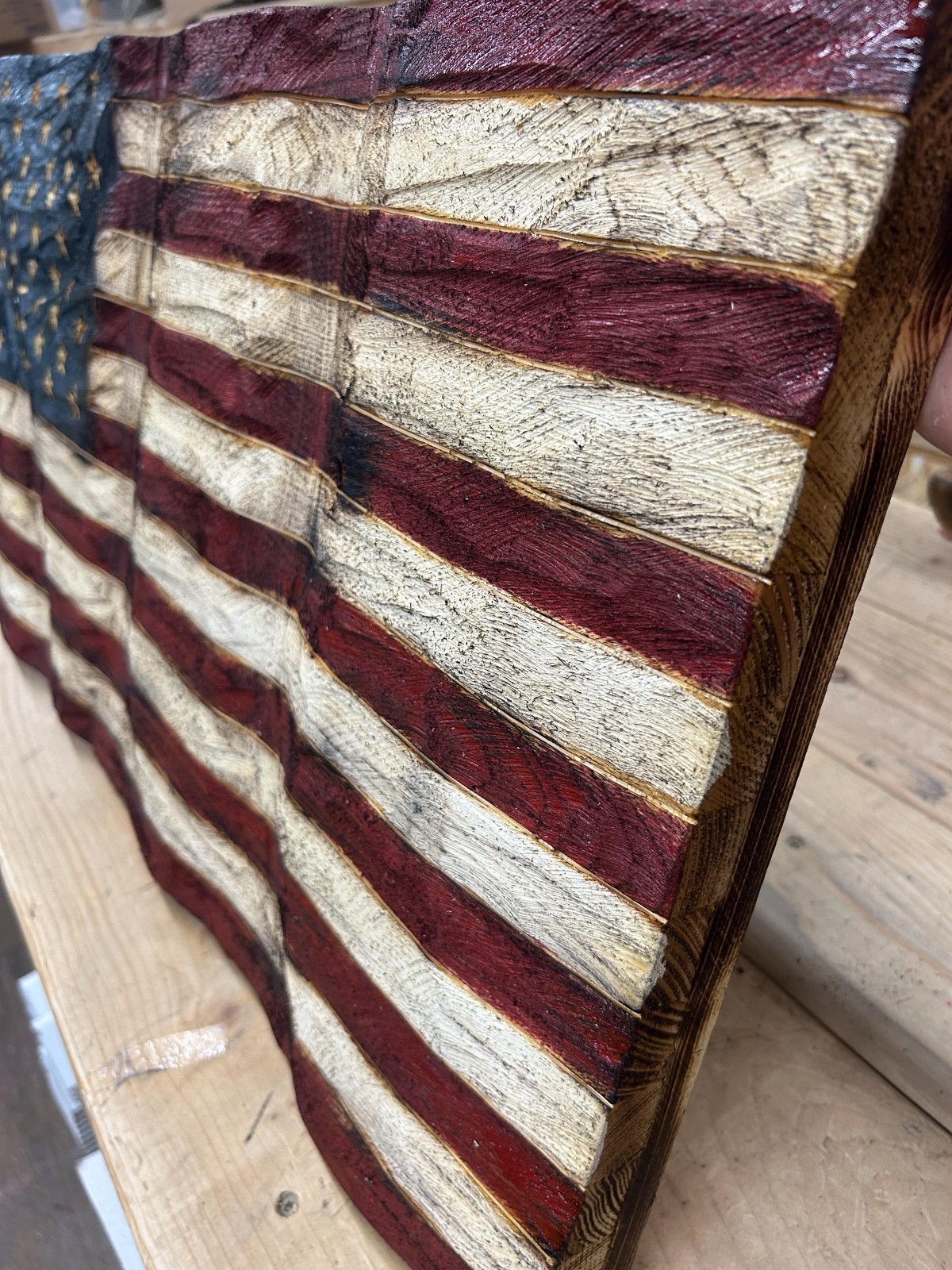 ALL ITEMS ARE MADE TO ORDER. MADE TO ORDER. Handmade wood wavy textured flag. Made to resemble a flag blowing in the wind. Hand chiseled for a textured look and distressed for a rustic appeal. Stars are hand etched. You won’t find a flag like it anywhere else! Multiple coats of Gloss polyurethane added for protection. Wall hangers included. 30x16 inches. ALL ITEMS ARE MADE TO ORDER.3-4 week lead time.