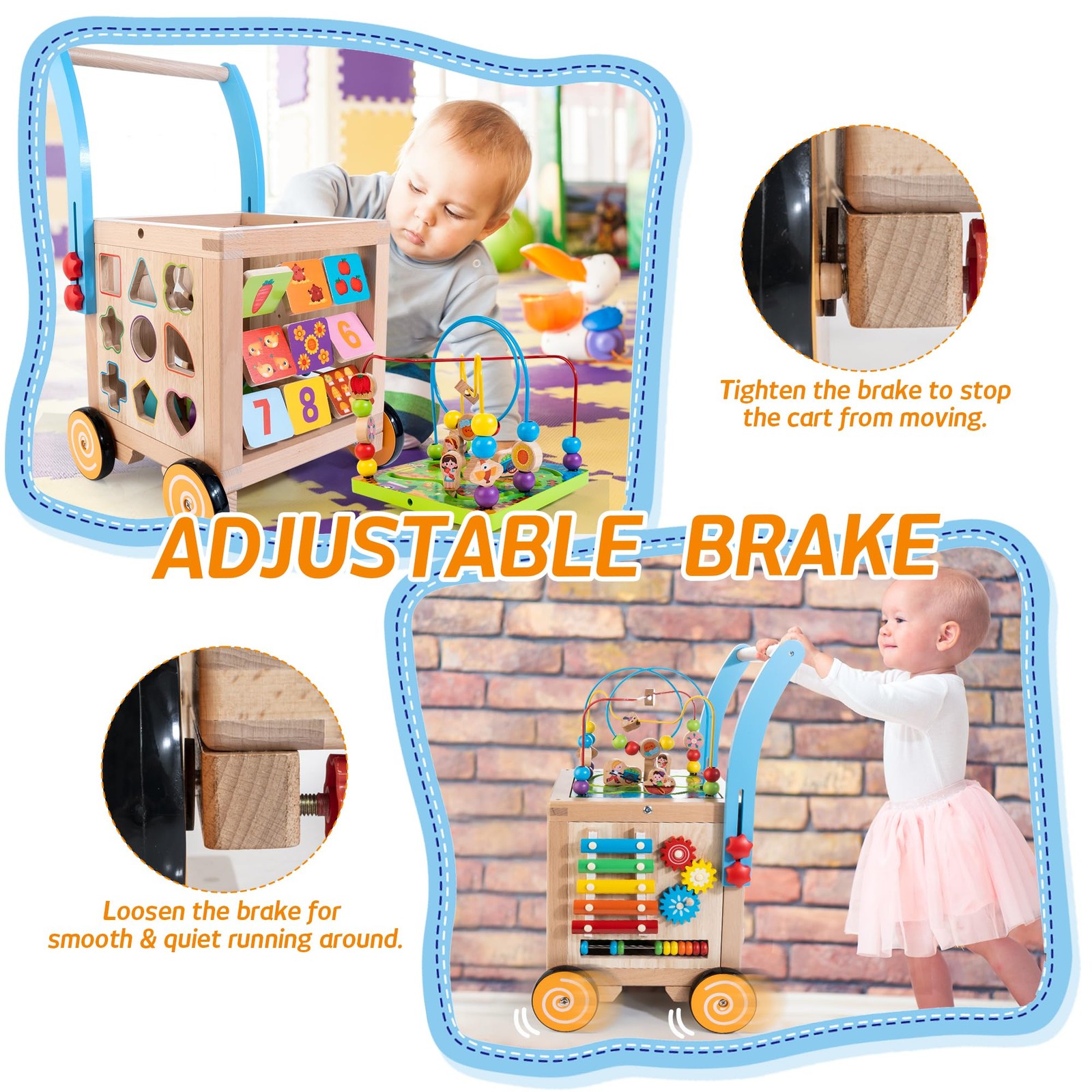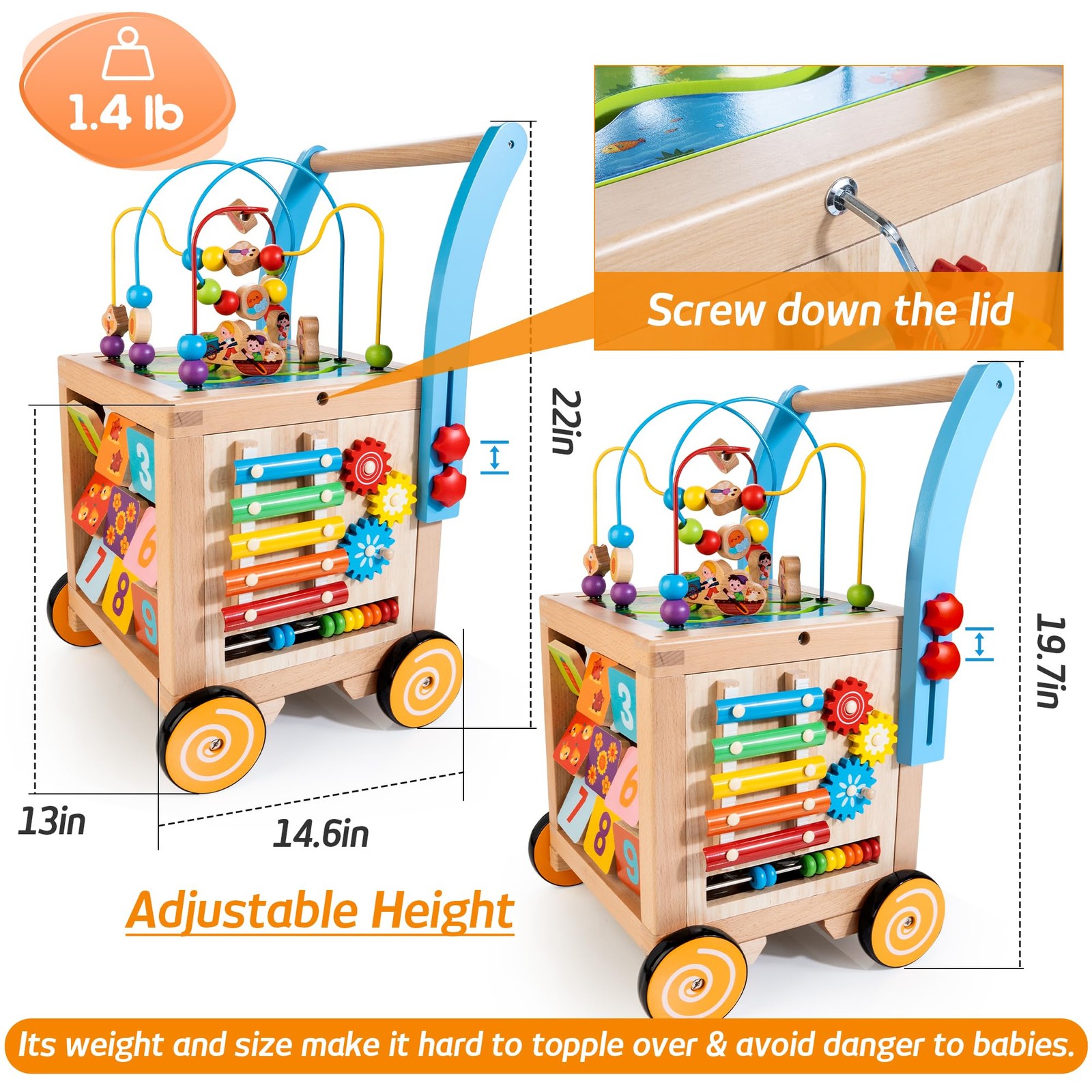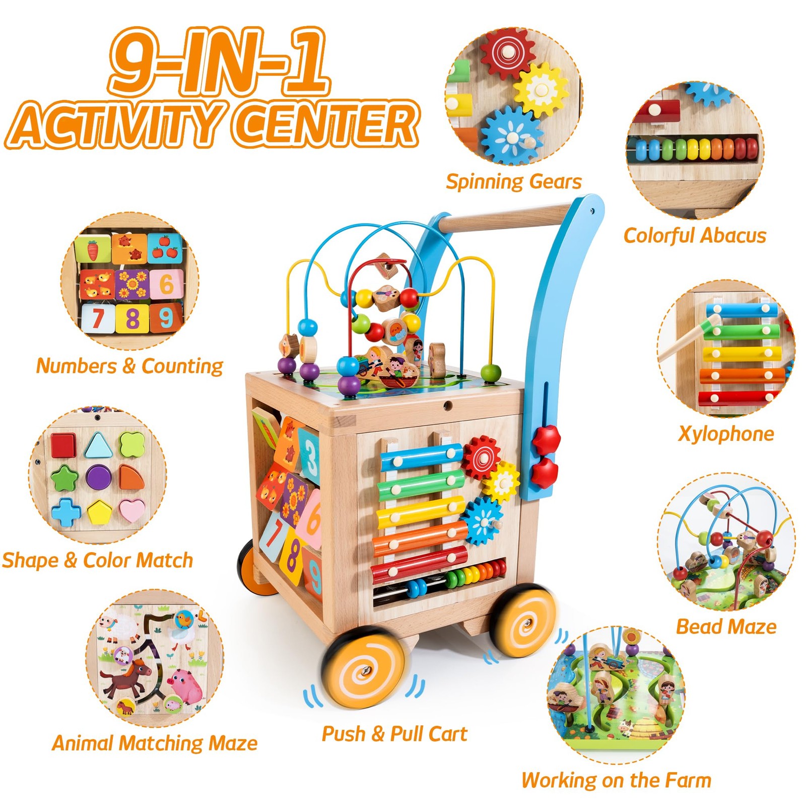 Introducing our 9 -in-1 Baby Walker and Activity Center , it is both a safe learning walker for 1 year old baby and a versartile baby toy. Designed to provide endless screen-free fun for your little ! This walker cube toy features 9 engaging activities , including numbers and counting games, shape and color matching, an animal maze, spinning gears, a baby xylophone, an abacus, a bead maze, a farm maze, and a push-and-pull cart. Rooted in Montessori principles , our wooden activity cube encourages parent-interaction, promoting essential skills such as language development, perception, and coordination through shared playtime. Crafted from high-quality materials , this sturdy wooden walker is finished with non-, water-based paint and equipped with non-slip rubber wheels. You can feel confident knowing that your is safe while learning and exploring. The walker features adjustable speed settings with brakes on the rear wheels, allowing you to customize the walking experience as your baby grows and develops their walking skills. An excellent choice for celebrating your ’s first birthday, this multifunctional wooden baby walker not only entertains but also supports movement, coordination, and balance. Thoughtfully designed, it’s a reliable option for parents seeking safe walking toys for toddlers learning to walk. Transform playtime into a valuable learning experience with our 9-in-1 Baby Walker and Activity Center ! 【Speed Adjustable Learning Walker】This baby push walkers encourages babies to stand, walk, and push with adjustable speed settings for safe walking. With brakes on the rear wheels, you can easily tighten or loosen the speed settings, providing a secure and customizable walking experience that adapts to your baby's growth. 【9-in-1 Activity Center】This activity center for baby features 9 engaging activities, including numbers & counting games, shape & color matching, an animal maze, spinning gears, a baby xylophone, an abacus, a bead maze, a farm maze, and a push-and-pull cart. It offers endless, screen-free fun for babies. 【Montessori Developmental Support】Designed with Montessori principles in mind, this wooden activity cube encourages parent-interaction while promoting language, perception, and coordination skills through shared playtime. 【Safe & Sturdy Construction】Made with high-quality materials, our wooden walker features a robust design, non-water-based paint, and non-slip rubber wheels, ensuring a safe and durable experience for young learners. 【Ideal 1st Birthday Gift】Perfect for celebrating a ’s first birthday, this versatile wooden baby walker and activity cube is not only a versatile toy, but an excellent tool for encouraging movement, coordination, and balance. 【Easy Assembly】The wooden walker can be set up in under 10 minutes. The top lid screws securely into place, so you won't have to worry about it getting lost.