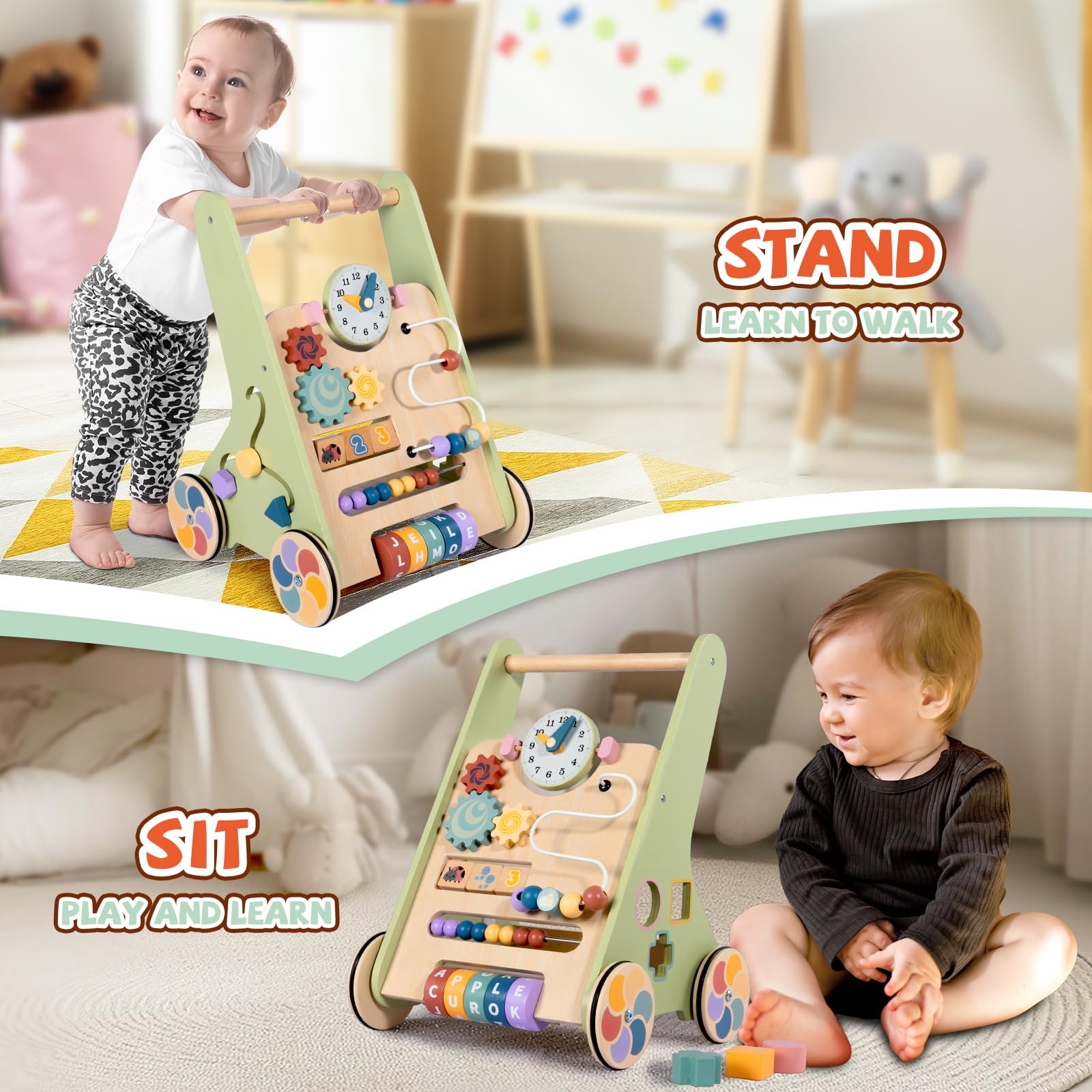 Walking Toys for 1 Year Old Boy Learning to Walk INTERACTIVE LEARNING PANEL: This wooden baby walker sparks curiosity in little explorers aged 6–12 months, with a vibrant interactive panel featuring a flip-pattern board, rolling alphabet wheel, bead maze, and spinning gears. It turns every push walk into a fun-filled learning journey through colors, motion, and coordination ADJUSTABLE SPEED CONTROL: Parents can easily control speed through screw adjustments, helping their walk at a safe pace. Whether indoors on hardwood or carpet, this walker for baby 6-12 months ensures steady balance and flexibility in any home environment DURABLE WOODEN CONSTRUCTION: Built from sturdy, eco-friendly wood and polished for smoothness, this wooden walker supports rough pushes and tugs while protecting tiny hands. Designed to last through the years, it’s a durable companion in your ’s early mobility journey SENSORY & IMAGINATIVE PLAY: Creative graphics and bright colors draw children’s eyes, while tactile shapes spark sensory exploration. This push walk toy doesn’t just help with walking—it becomes a mobile learning station that supports imagination, coordination, and independent discovery BUILT-IN TOY STORAGE: A built-in rear storage basket lets toddlers take along their favorite plush toys or books. This walker for baby 6-12 months creates emotional bonding through movement—turning daily walks into playful journeys of companionship and growth