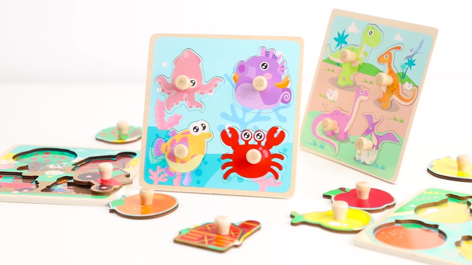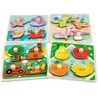 đ ăSafe Wooden Toddlers Puzzlesă Funsland wooden puzzle toy is specially designed for toddlers. It is use High temperature thermal transfer process to print patterns, donât worry about color fading! The surface of the puzzle is smooth, round and without broken edgesïŒyour baby can easily and safely touch and grasp wooden puzzles with smooth edges. This is the best gift for toddlers and 1-2 year old boys and girls. đ ă4 Different Puzzlesă This wooden puzzle has 4 different series of puzzle, including dinosaurs, farm, fruit and sea creature. Each puzzle has 4 patterns. They help to improve kid's visual space awareness. Besides, you can practice your little one about colors shapes. đă Durable and with Handleă Our wooden puzzles are made of environmentally friendly thickened wood, so it is hard and not easy to deform or crack, very durable, and your baby can enjoy it for a long time. The size of each puzzle is 5.9 x 5.9 x 0.2 inches, and each wooden block has a handle, which is more convenient for the baby's small hands to hold. đă Learning Through Playă Wooden animal puzzles is an important early education learning toy for toddlers. Wooden puzzles can help baby improve their ability to create attention and solve difficult problems. It can also cultivate children's patience, imagination and hand-eye coordination. đ ăToy Life Guaranteeă The puzzle is big enough, each part is big enough, children will not swallow. Please rest assured to buy. If your toy has any problems within the first 1 months after possession, we will replace it for you free of charge.