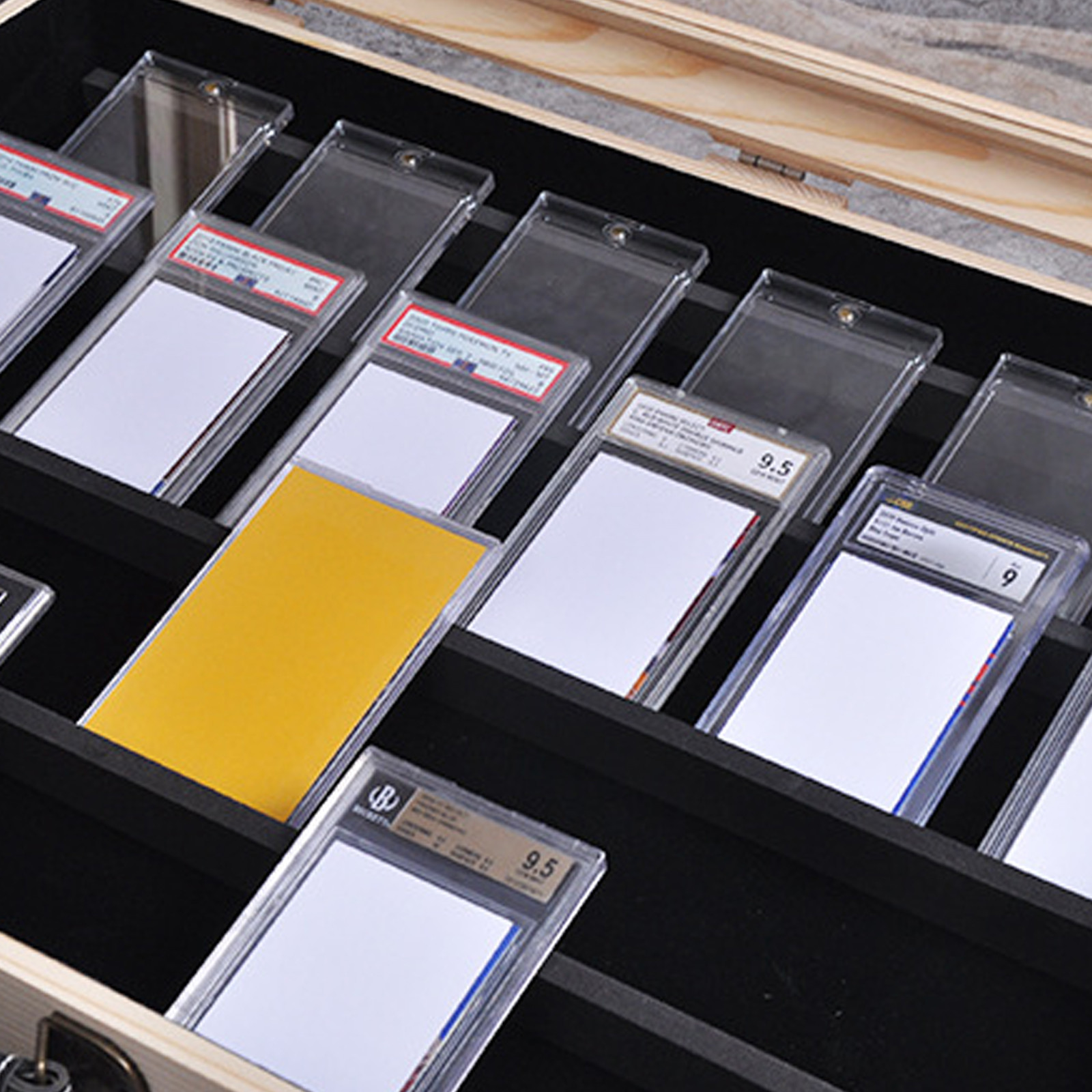 Beschreibung Konstruktion aus Holz: Gefertigt aus hochwertigem, langlebigem Holz, bietet diese Vitrine einen eleganten und zeitlosen Look, der jede Sammlung ergänzt. Die natürliche Holzmaserung verleiht ihr einen Hauch von Eleganz und macht sie zu einem herausragenden Stück für Ihr Zuhause oder Büro. Vielseitige Aufbewahrung: Dieser Organizer wurde für die Aufbewahrung von PSA/TCG-Sammelkarten entwickelt und eignet sich perfekt für Basketball-, Baseball- und andere Sportkarten. Er ist auch mit Sammelkartenhüllen kompatibel und somit eine vielseitige Lösung für alle Ihre Aufbewahrungsbedürfnisse. Einfacher Zugang und Anzeige: Das nach oben offene Design ermöglicht einen einfachen Zugriff auf Ihre Karten, während sie gleichzeitig professionell und geordnet präsentiert werden. Perfekt für Aufbewahrungs- und Ausstellungszwecke. Kompakt und tragbar: Trotz seiner robusten Konstruktion ist dieses Holzetui leicht und einfach zu transportieren. Egal, ob Sie auf dem Weg zu einer Messe sind, bei einem Freund zu Besuch sind oder einfach nur Ihre Sammlung zu Hause neu ordnen wollen, dieses Etui ist die ideale Lösung für Sie. Produkt enthalten: 1 x Aufbewahrungsbox Anmerkung: 1.aufgrund der manuellen Messung, kann es leichte Fehler in der Produktgröße sein. 2. aufgrund der verschiedenen Monitore und Lichter, kann das Bild nicht die tatsächliche Farbe des Elements reflektieren.