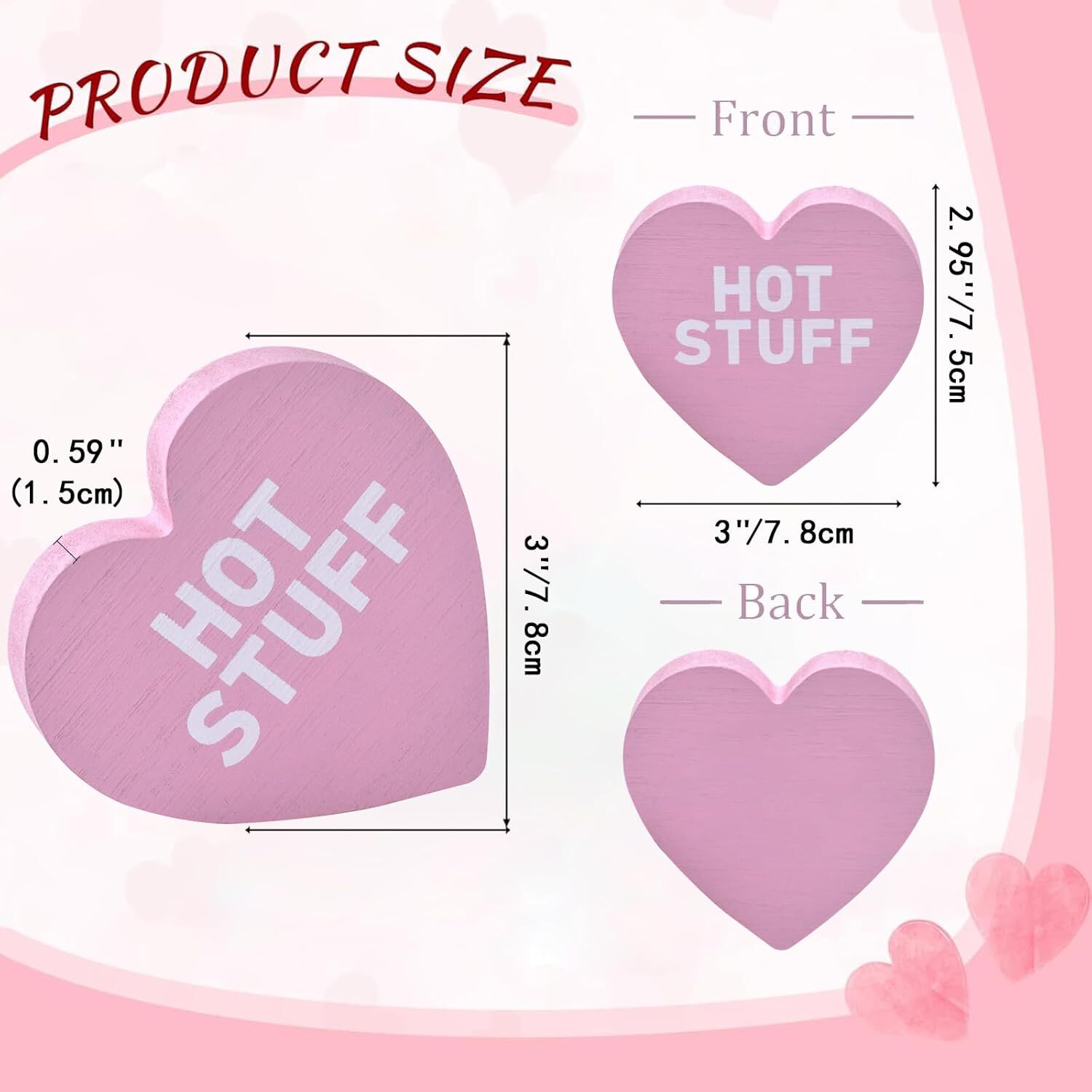 Wooden Valentines Day Decor Heart Blocks, 6PCs Freestanding Wood 6pcs Product Details Color: 6pcs Brand: IDATOO Theme: Love Material: Wood Style: Contemporary Occasion: Valentines Day Recommended Uses For Product: Home Mounting Type: Tabletop Cartoon Character: Love Finish Type: Polished Special Feature: Handmade Product Care Instructions: Light Dusting, Spot Clean Seasons: All Seasons Number of Items: 6 Product Dimensions: 3 x 0.6 x 0.1 inches Item Weight: 11.3 ounces Manufacturer: hedian Country of Origin: China Item model number: hedian-v-01 BRIGHTEN UP YOUR SPACE WITH FESTIVE HEARTS: This 6-piece set of wooden heart decor brings a festive touch to your Valentine’s Day decor. With hearts in vibrant shades of red, pink, and white, each block stands freely and creates a delightful centerpiece for Valentine decorations on tables, shelves, or tiered trays. Add these to your home or office to instantly brighten up your space with a warm, romantic vibe PERFECTLY SIZED AND FREESTANDING DESIGN: Crafted with attention to detail, these Valentine decor heart blocks feature a smooth finish and are perfectly sized at 3 inches in height and 0.6 inches thick. Their freestanding design makes them ideal as Valentine decorations for home, effortlessly displayed on tables, desks, or mantles to spread love in any room SWEET MESSAGES THAT SAY IT ALL: Each piece in this Wooden Valentines Day Decor set is printed with classic, heartfelt phrases like “LOVE,” “HUGS,” and “BE MINE,” adding a meaningful touch to your Valentine decorations. These conversation hearts are sure to bring smiles and warmth to anyone who sees them, making them a charming addition to Valentine decor for any setting ADORABLE DISPLAY OR GIFT IDEA: These heart shape table blocks are an adorable addition to a Valentine’s tiered tray or shelf display. With their charming phrases and inviting colors, they’re also a thoughtful gift for loved ones on Valentine’s Day, anniversaries, or weddings. Friends and family will adore these freestanding wood heart signs, perfect for celebrating love in any form DECOR FOR EVERY ROOM, ALL YEAR LONG: These delightful wood hearts add a festive touch to any room—from kitchen counters and bookshelves to bedrooms or office spaces. Whether for a cozy Valentine’s gathering or as year-round heart decor, this set elevates your space with a warm, romantic aesthetic. Add these wooden blocks to your Valentine decor collection for a touch of love anywhere you need it At IDATOO, we are dedicated to creating charming decor pieces that add warmth and personality to your home throughout the seasons. IDATOO 6Pcs Wooden Valentines Day Heart Blocks bring a delightful and romantic touch to your Valentine’s Day decor, perfect for making your home cozy and inviting. KEY FEATURES: Colorful Valentines Day Decor – This set includes six vibrant heart-shaped blocks in red, pink, and white, making it an eye-catching addition to your Valentine decorations for home. Freestanding Wood Heart Signs – Each wooden heart block is 3 inches high and 0.6 inches thick, allowing them to stand freely on tables, mantles, or shelves without any support. Unique Heart Shape Table Blocks – Each heart features a classic Valentine’s Day message such as "LOVE" and "BE MINE," making them the perfect Valentine decor to spread love throughout your space. High-Quality Wooden Valentines Day Decor – Crafted from sturdy wood with smooth edges, these hearts are well-made and perfect for creating a lasting Valentine’s Day display. Perfect Valentines Tiered Tray Decor – These small heart blocks fit easily onto tiered trays, enhancing your table decor with an adorable Valentine’s theme. Versatile Home Decor – Suitable for any room, these hearts are great as Valentine decorations for home, including the kitchen, living room, or bedroom, bringing love to every corner. Thoughtful Gift Choice – These charming heart blocks make an ideal Valentine’s gift for friends, family, or that special someone, spreading joy with a touch of romance. SPECIFICATIONS: Colors: Red, Pink, White Size: 3’’/7.8cm H, 0.59’’/1.5cm Thickness Material: Wood Messages: "LOVE," "BE MINE," "HUGS," "HOT STUFF," "XOXO," "I'M YOURS"