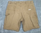 Wrangler Carpenter Shorts Mens 42 Brown Canvas Utility Authentic Issue Work READ Stains, some fading and wear around seams but no holes or tears and in overall good pre-owned condition and laundered. Please see measurements in photos. I ship next business day, but sometimes same business day and Saturday if order is paid for early enough. Please let me know if you have any questions. I am open to offers!! Feel free to look at other items in my store! Thanks!