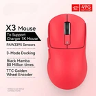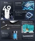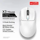 Product Parameters: Model: X3pro Connection: Wired/2.4G/BT5.2 Image Sensors: PixArt PAW3395 Kailh Switch: Black Mamba 80 million times Accelerated Speed: 50G Movement Speed: 650IPS 2.4G Return Rate: up to 4KHz DPI: 800-26000dpi Weight: 59g±3g Battery capacity: 300mAh Working Life: 65H Size: 118.5x61x39.7mm Model: X3 Connection: Wired/2.4G/BT5.2 Image Sensors: PixArt PAW3395 Kailh Switch: Black Mamba 80 million times Accelerated Speed: 50G Movement Speed: 650IPS Return Rate: 125-1000Hz DPI: 800-26000dpi Weight: 49g±3g Battery capacity: 300mAh Working Life: 65H Size: 118.5x61x39.7mm Note: The X3Pro mouse adjusts its polling rate based on the usage environment. Generally, the faster the movement speed, the quicker the button response, and the higher the polling rate.